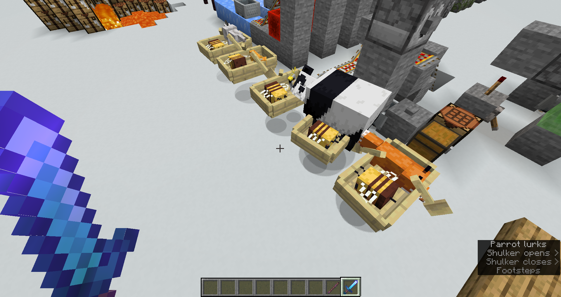 When inside of a boat or minecart, bees still display body movement and wing flapping animations, despite the fact that they aren't flying or hovering off the ground at all. This doesn't make much sense, and it would be better if they used the stationary wings animation like when sitting on the ground next to the player when holding a flower.