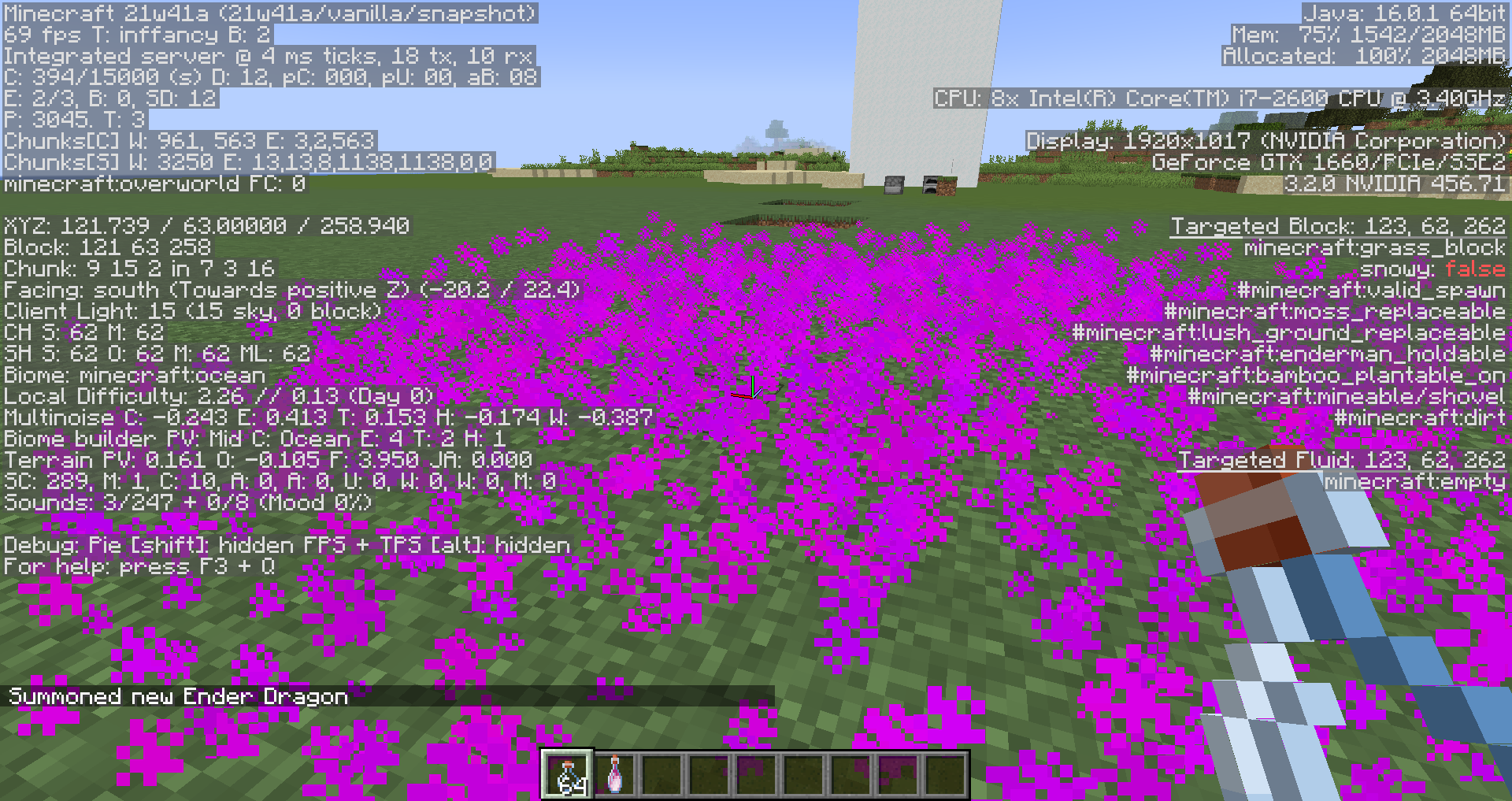/summon minecraft:ender_dragon ~ ~ ~ {DragonPhase:5}Collect some of the dragon's breath using the bottles and as you do this, take note of whether or not the hand animation plays.