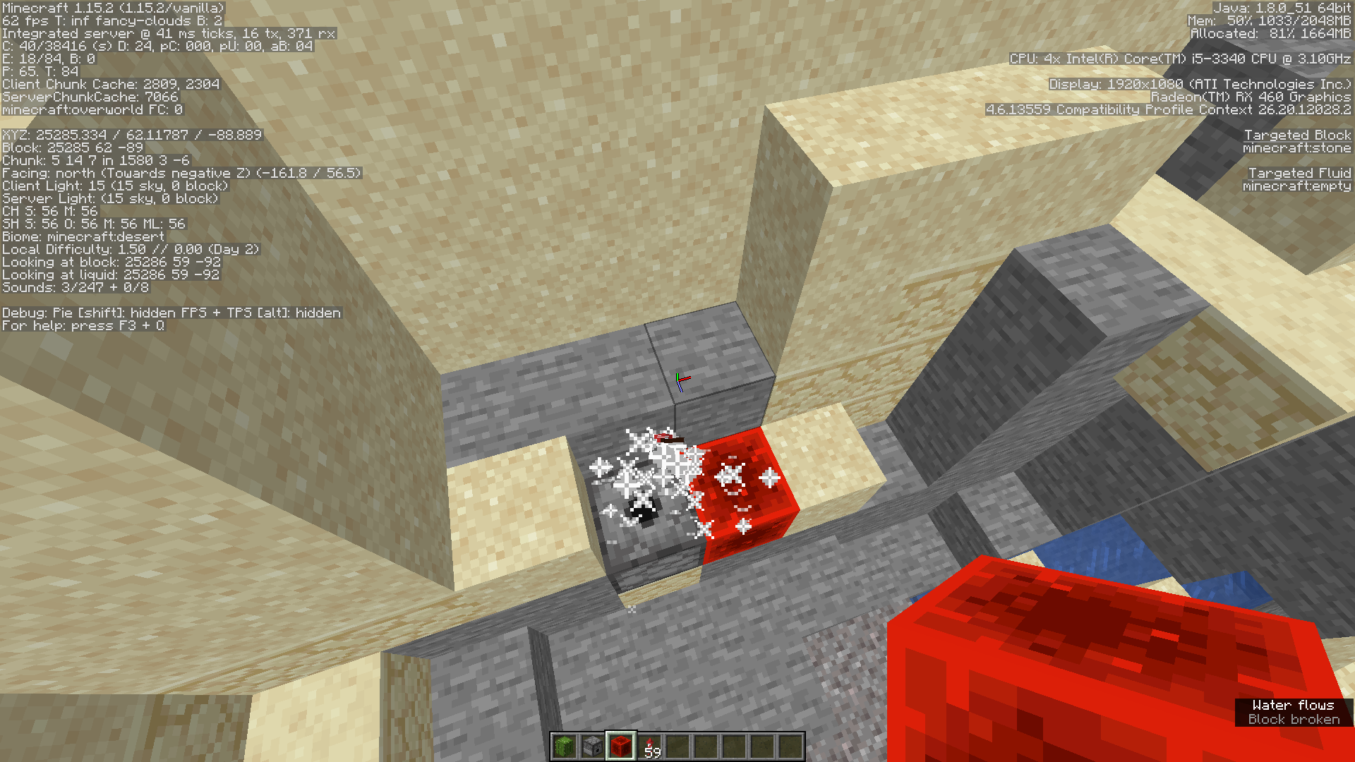 When you fire a firework from a dispenser and the firework hits a block, the firework slowly moves in the mid-air, even there are blocks that should the firework hit. When it finally hits a block and you remove that block, it gets completely stuck.