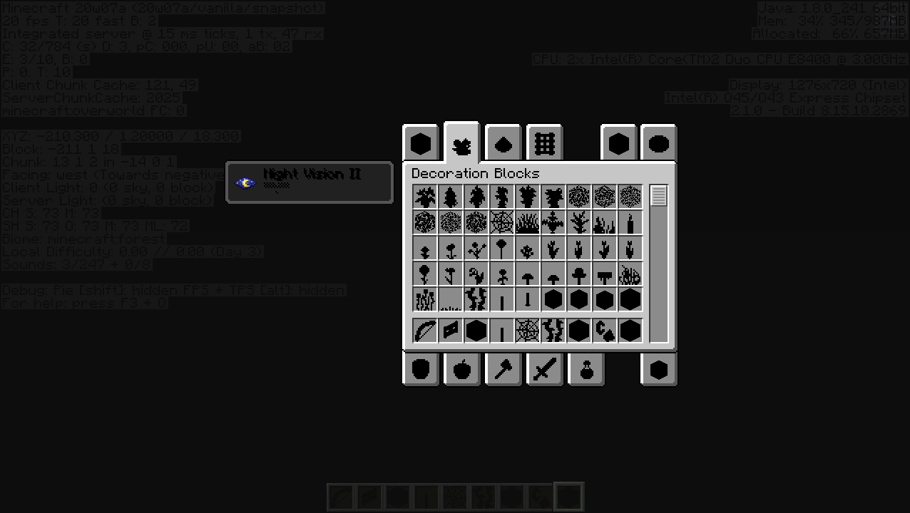 Go under y=0 if you are in first person, or move the camera under y=0 if you are in third person. You could see everything become black, and if you open the inventory, all the items are black, even the text
