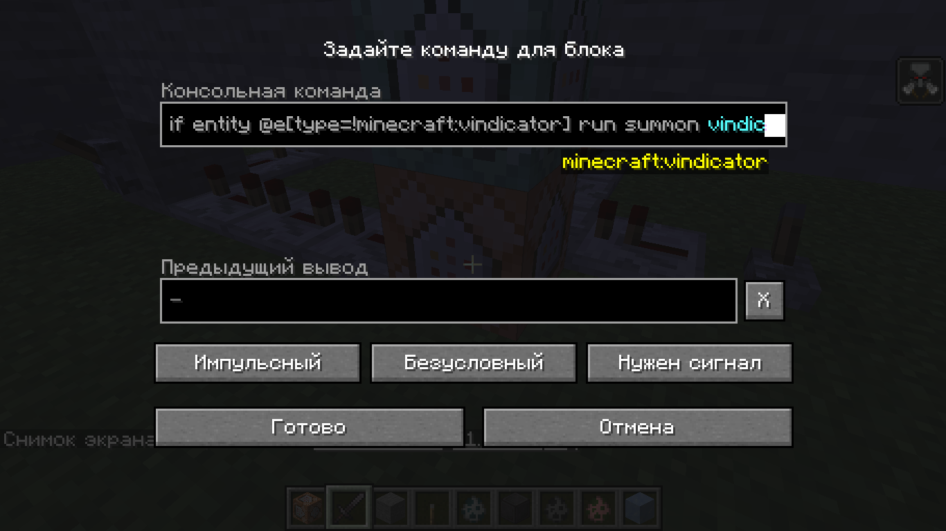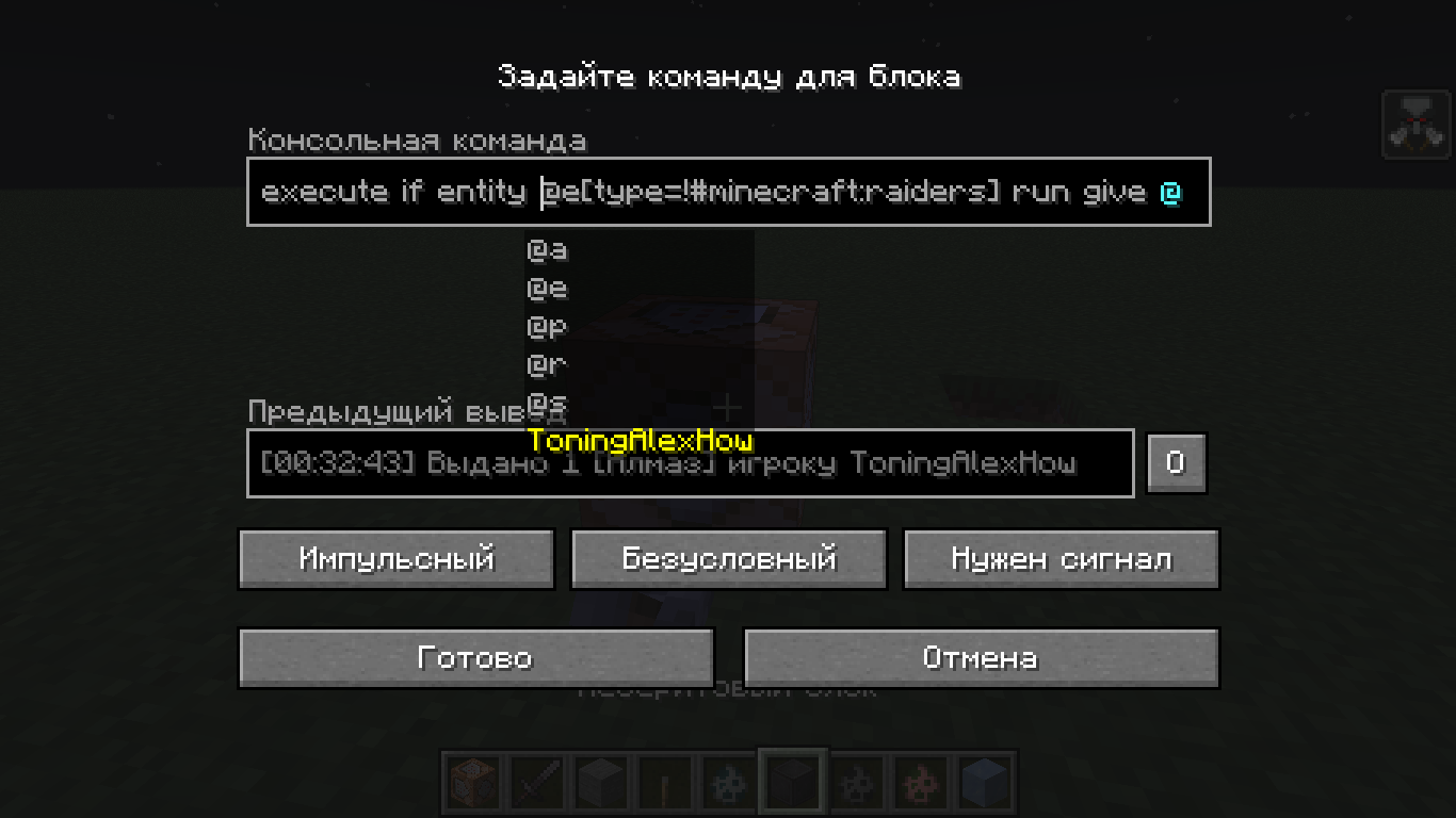 As you can see, I was trying to write a command. This command was supposed to give me a diamond (for example) by pressing the lever if there is any entity in the loaded chunks other than raiders. But even in their presence, at the touch of a lever, I get a diamond. Am I doing something wrong?