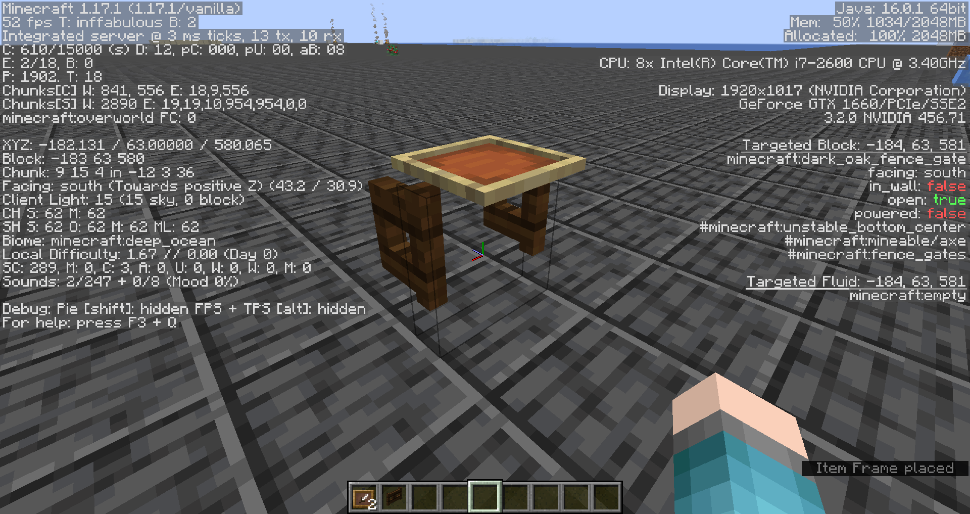 I would expect the item frame to stay on top, regardless of the fence being opening or closed, and not pop off, and also that is should let me place it down when the fence is closed as well.