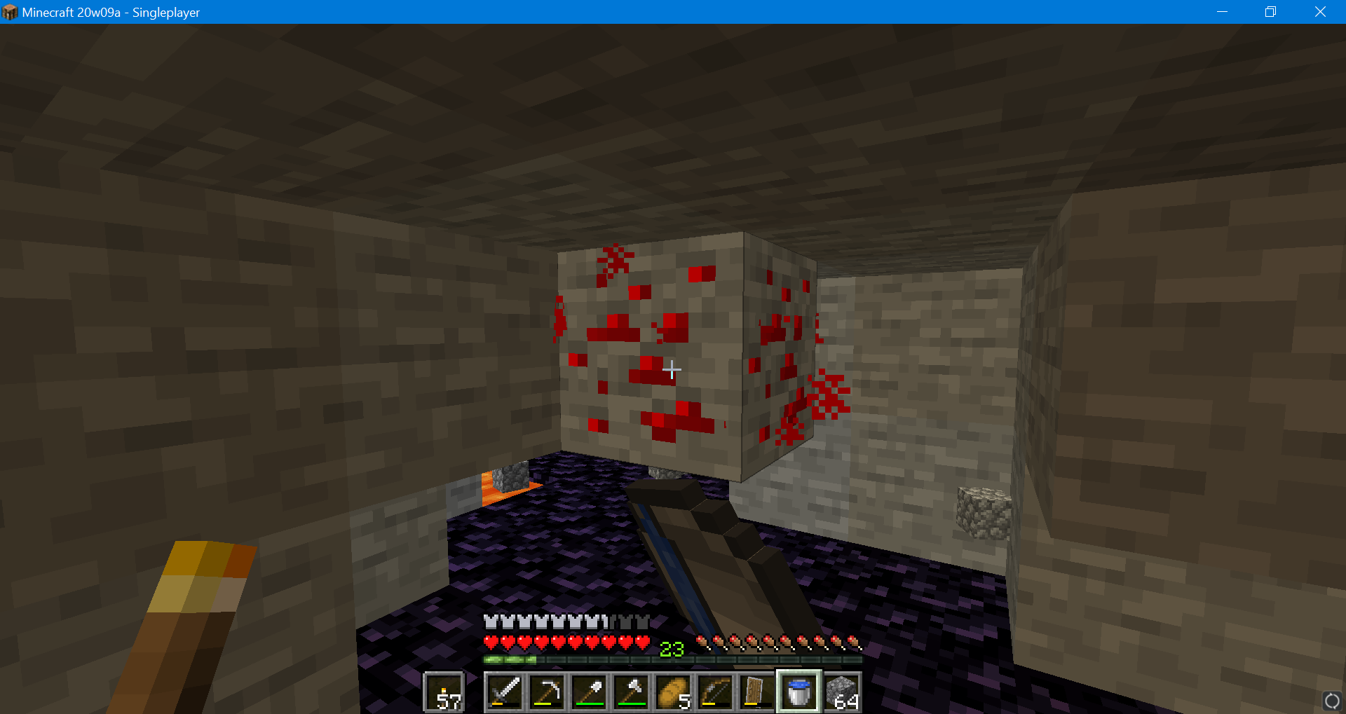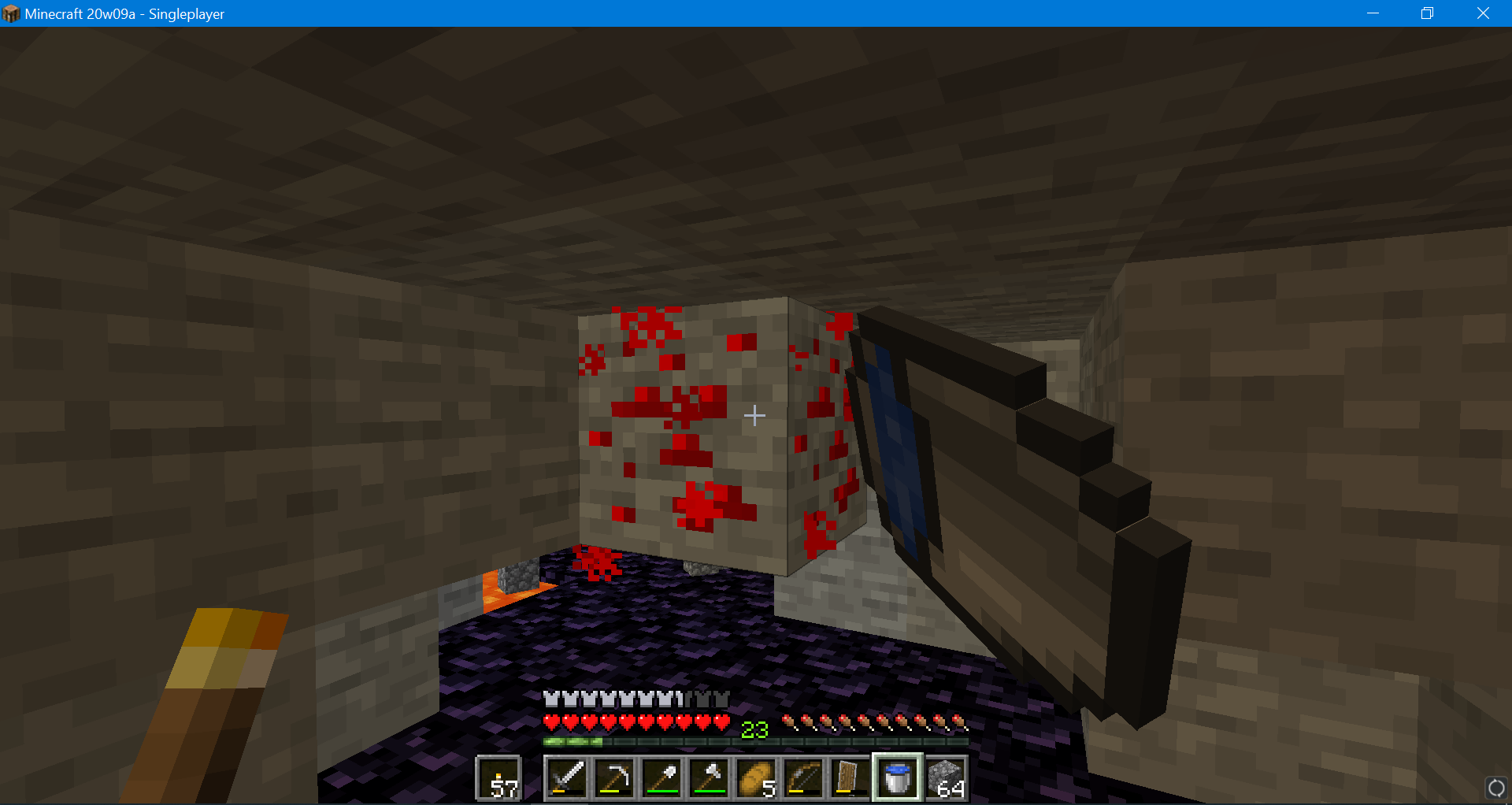 While mining I tried to place a water bucket on Redstone ore to quench some lava beneath it, but it wouldn't let me place it. I also tried using a bow and it seems to think that making the Redstone glow is an action like toggling a lever, and is taking priority over my item. I don't know what version this started in, I was just playing on the 20w09a snapshot at the time.