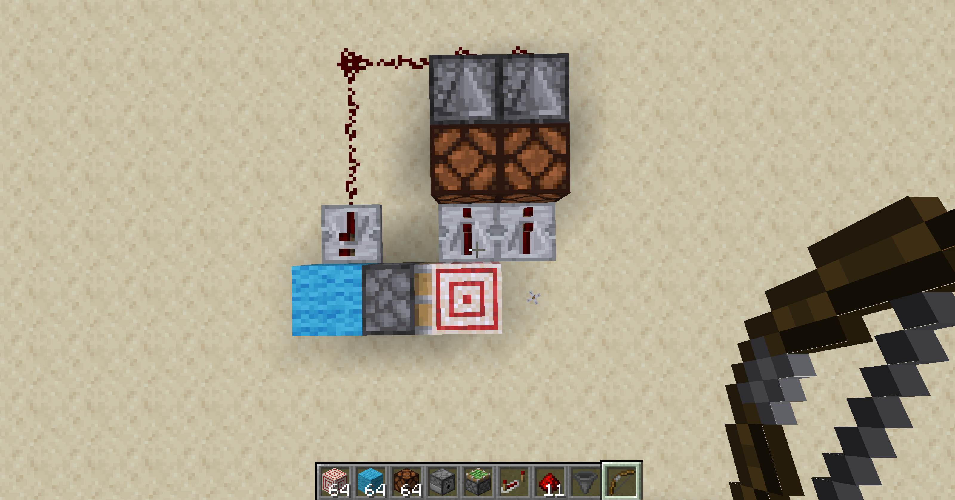 In the three pictures titled "signal_experiment", I have set up two repeaters at the locations where a target block could be when pushed and pulled by a sticky piston. As per the previous naming scheme, the "signal_experiment_layout" is the circuit at rest before any projectiles are fired. "signal_experiment_frozen shows the sticky piston having spit out the target block and the arrow that triggered the piston firing having fallen down to the ground. Despite this, the target block emits a continuous redstone signal which keeps the right repeater powered. This signal state persists so long as the target block is not affected in any way. Firing a projectile at the target block again as shown in "signal_experiment_reset" causes the target block to de power, causing the sticky piston to fire again to retract the target block. Again, I apologize I cannot provide a video myself and I urge any bug fixers to play around with the provided circuit yourself to see specific interactions and redstone timings.