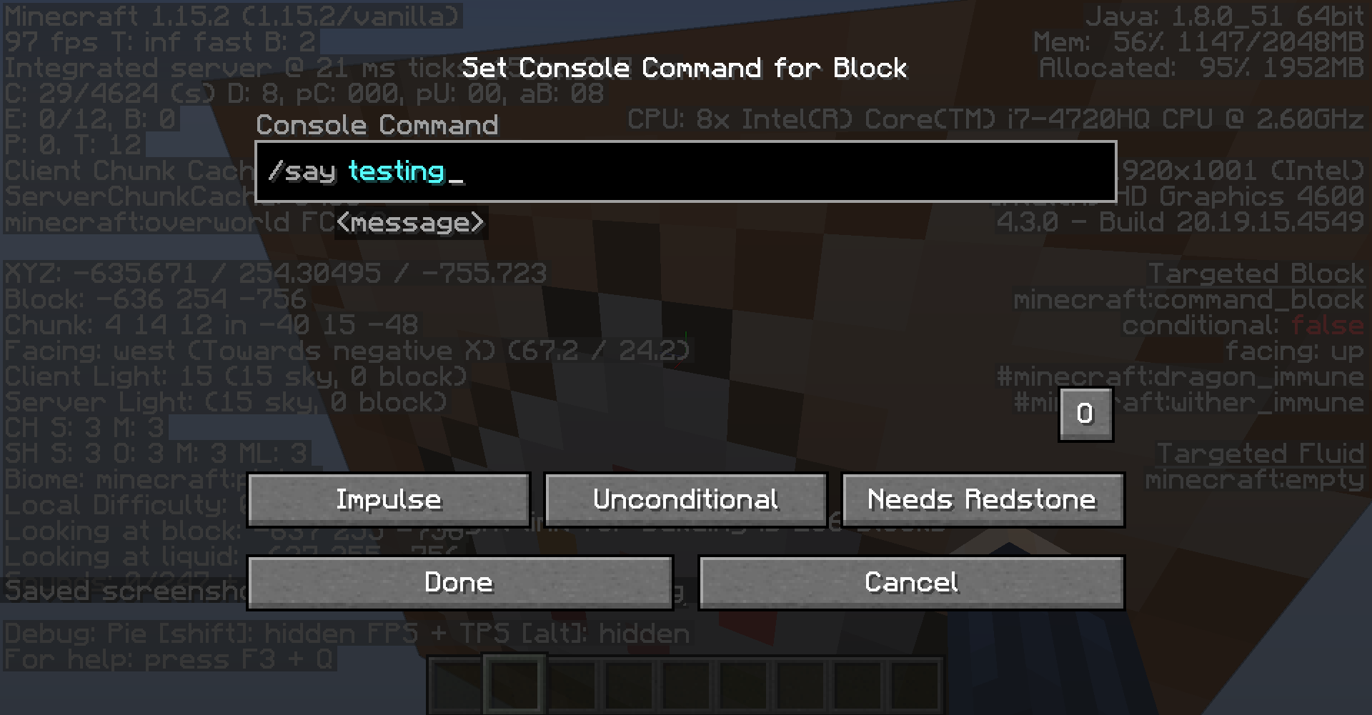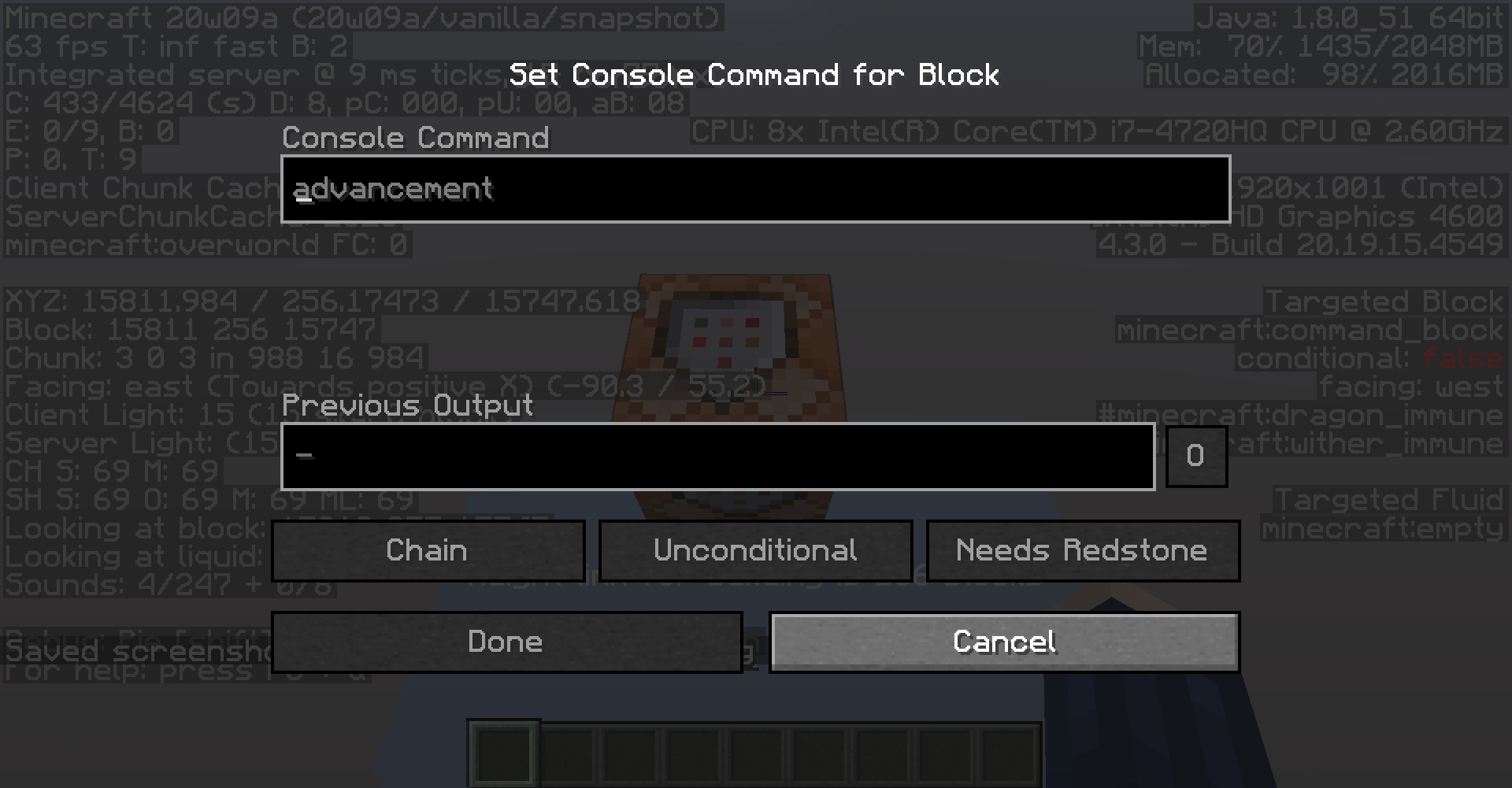 When accessing a command blocks face that is aligned with the build limit, the commands inside the command block don't load. (Or take a very long time to load, I haven't managed to get them to though) In the first screenshots I'm playing on a singleplayer 1.15.2 creative world. In the last two I'm in 20w09a (The newest 1.16 snapshot). By side aligned with the build limit, I mean the top side of the command block when the command block is at y=255. The greyed out buttons show that the command block's content hasn't loaded. Th