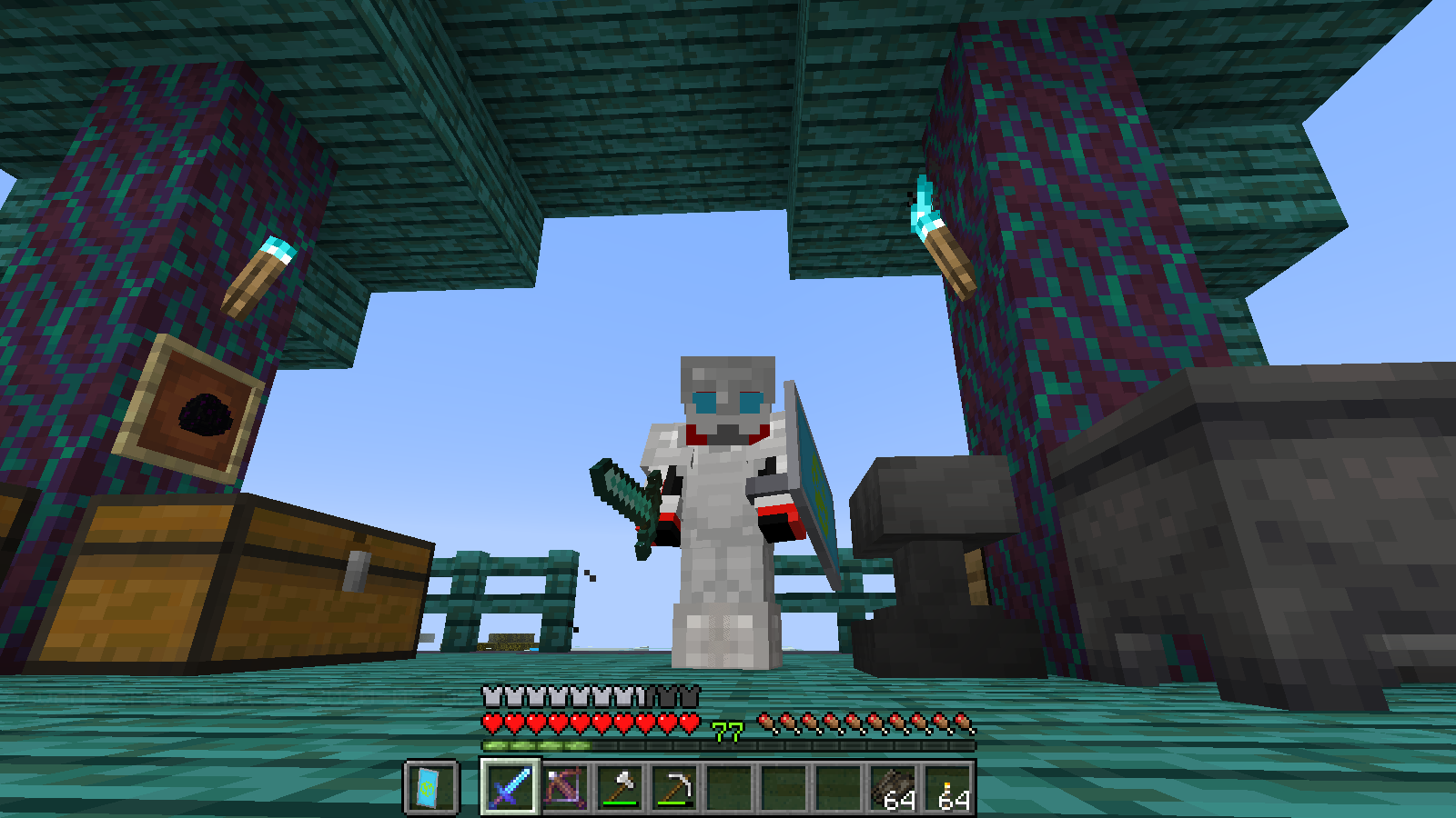 Now then, my shield was not enchanted and did not have any enchantment glint on it. And neither was my chestplate enchanted, only my boots, and my boots enchanted glint did not carry over onto the shield. Therefor, my issue is not a duplicate of MC-167043 / MC-167477, but it does involve a shield breaking enchanted items enchantment glint.
