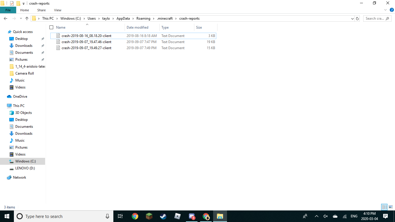 [minecraft/crash-reports/crash-<DATE>-client.txt|https://minecrafthopper.net/help/guides/finding-minecraft-data-folder]here.If you cannot find a crash report, please attach the full launcher log found in