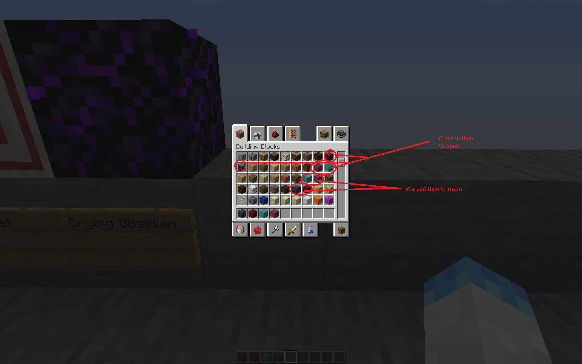 In the creative menu the Crimson and Warped Hyphea and Stripped forms are swapped to where it goes Warped then Crimson while the other planks and stems go Crimson then Warped.