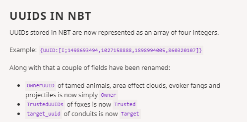 OwnerUUIDof tamed animals, area effect clouds, evoker fangs and projectiles is now simplyOwnerTrustedUUIDsof foxes is nowTrustedtarget_uuidof conduits is nowTarget