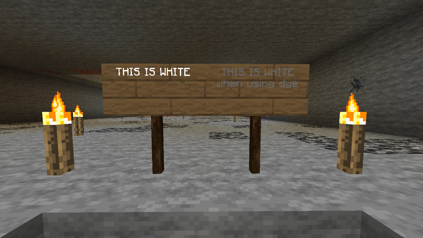 /give @p minecraft:spruce_sign{BlockEntityTag:{Text1:'{"text":"THIS IS WHITE","color":"white"}'},display:{Name:'{"text":"Custom Sign"}'}}It actually gave me the real brightness of the coded color of the game, and later then, I compared the dark gray dye with black dye, for some reason they just looked the same.
