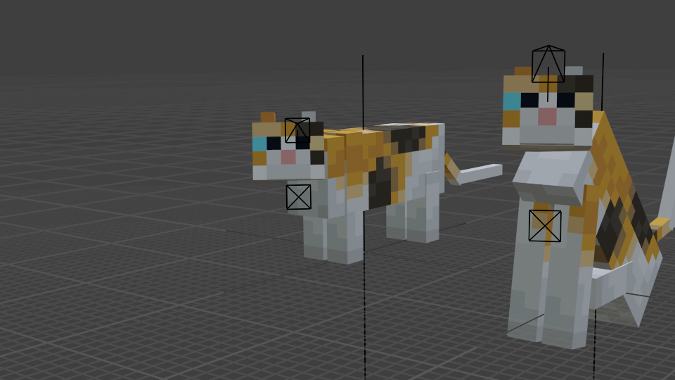 I took Blender and created a sitting and a standing calico-type cat (texture is mirrored somehow). When cats are idle, the cats look straight forward, not looking at any point: