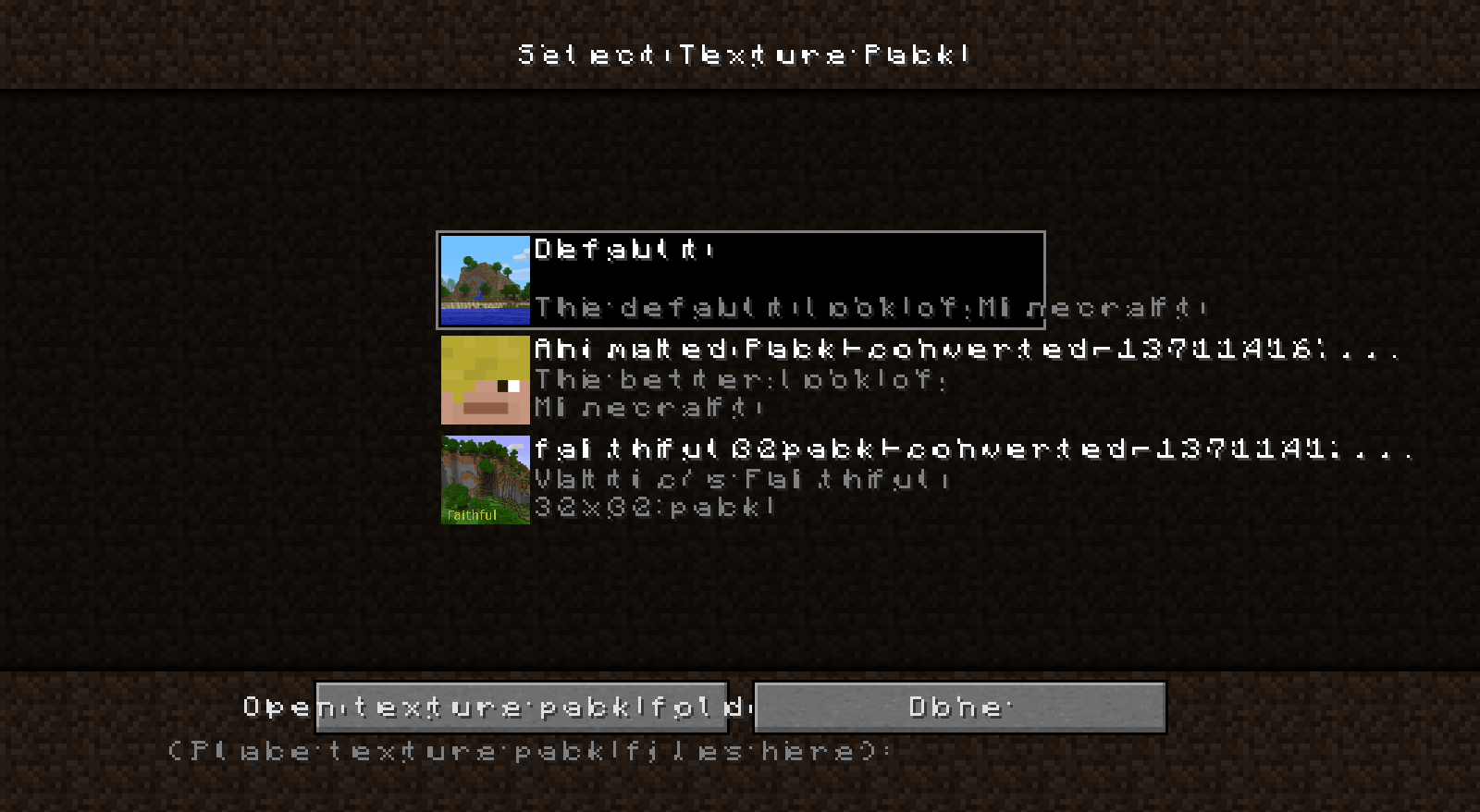I wanted to try out the new resource packs, but I wasn't sure how to add in new sounds. I used the texture pack to resource pack converter that I got from Mojang.com, and then I put the resources folder in to the new resource pack folder. The texture pack (or now resource pack) did not change the font, it only made a few blocks animated that are not normally animated (glowstone, tall grass, burning furnaces, and brewing stands). But, when loading up MC, the font was messed up. It did not change when I switched to the default resource pack. I have some screenshots to show what happened.