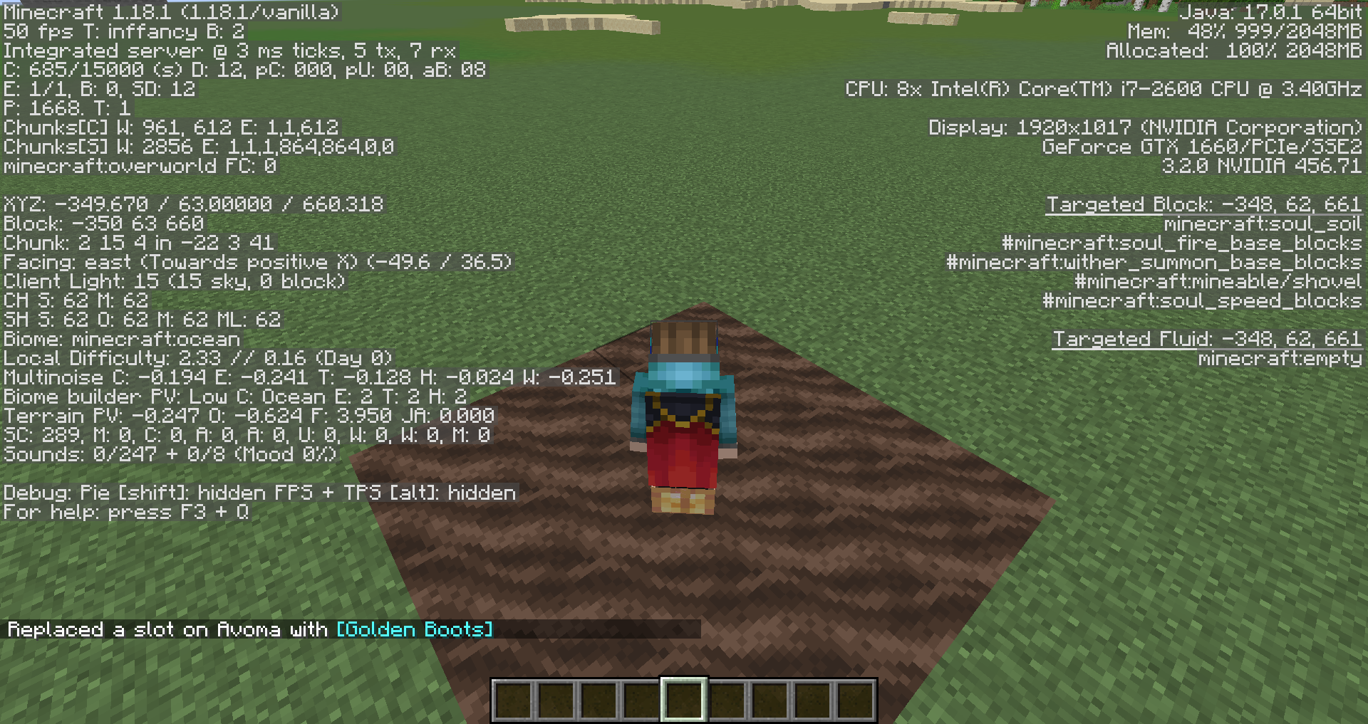 Equipping or unequipping boots enchanted with soul speed whilst standing on soul blocks would correctly grant or remove the soul speed enchantment effect.