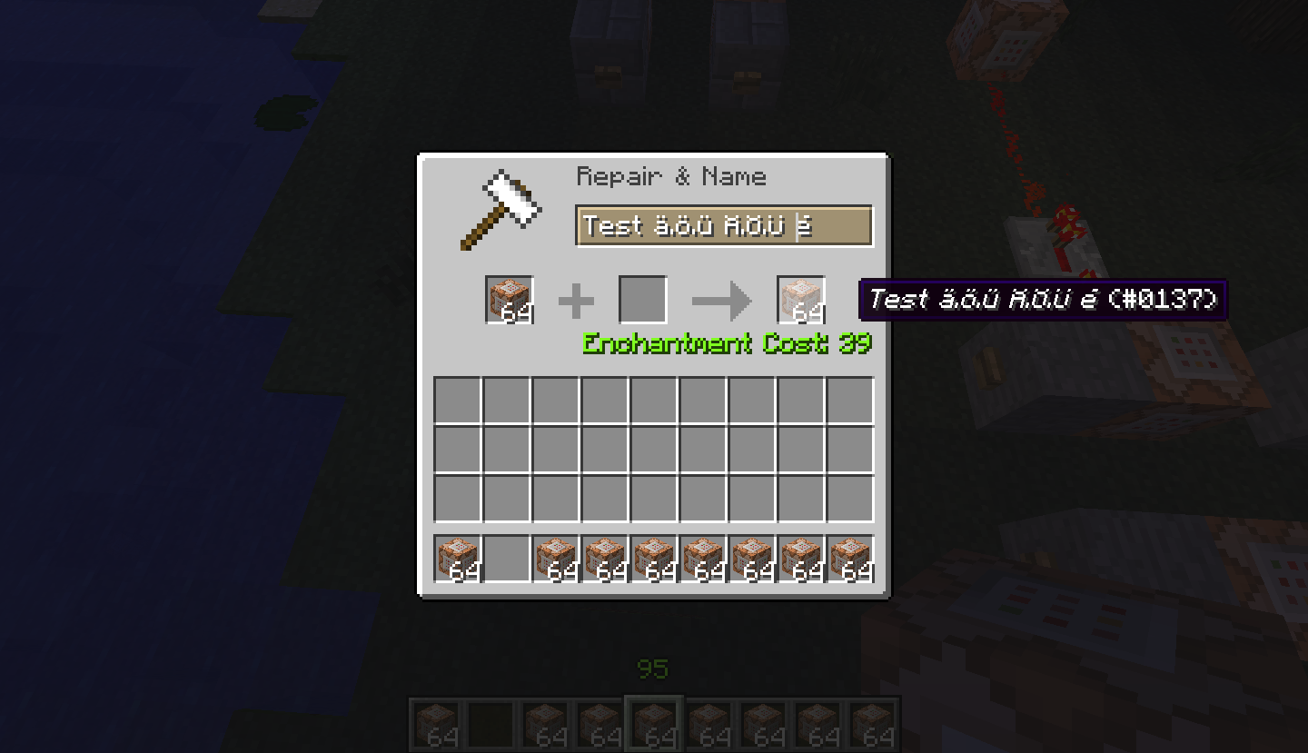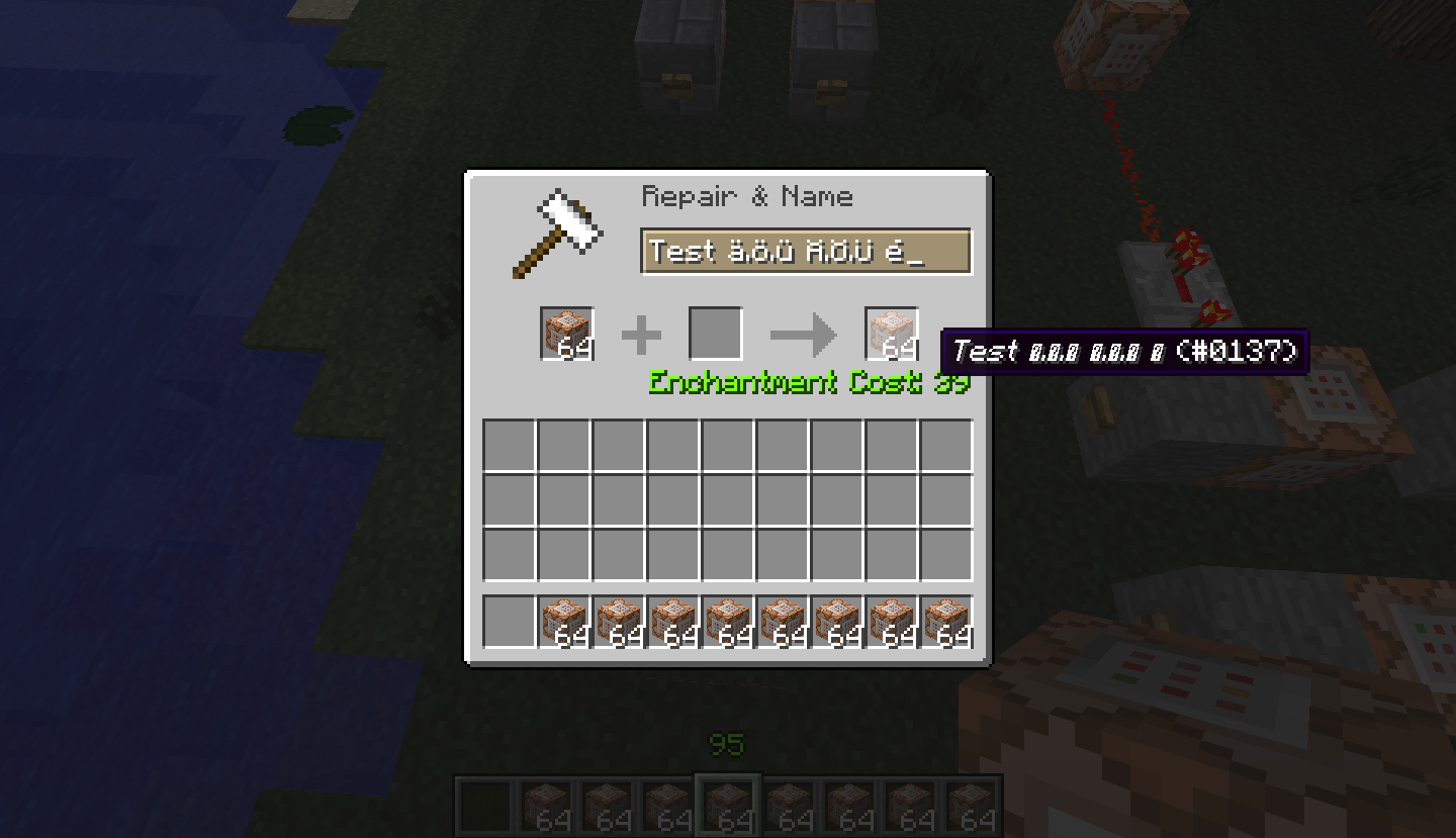 This issue can especially be a problem for map makers (but other command block users as well) who use languages different from English and who don't use external NBT editing tools. The reason for this is that renamed command blocks with "say" commands will output those invalid question mark characters on the chat screen. (See screenshot "chat-incorrect.png".)