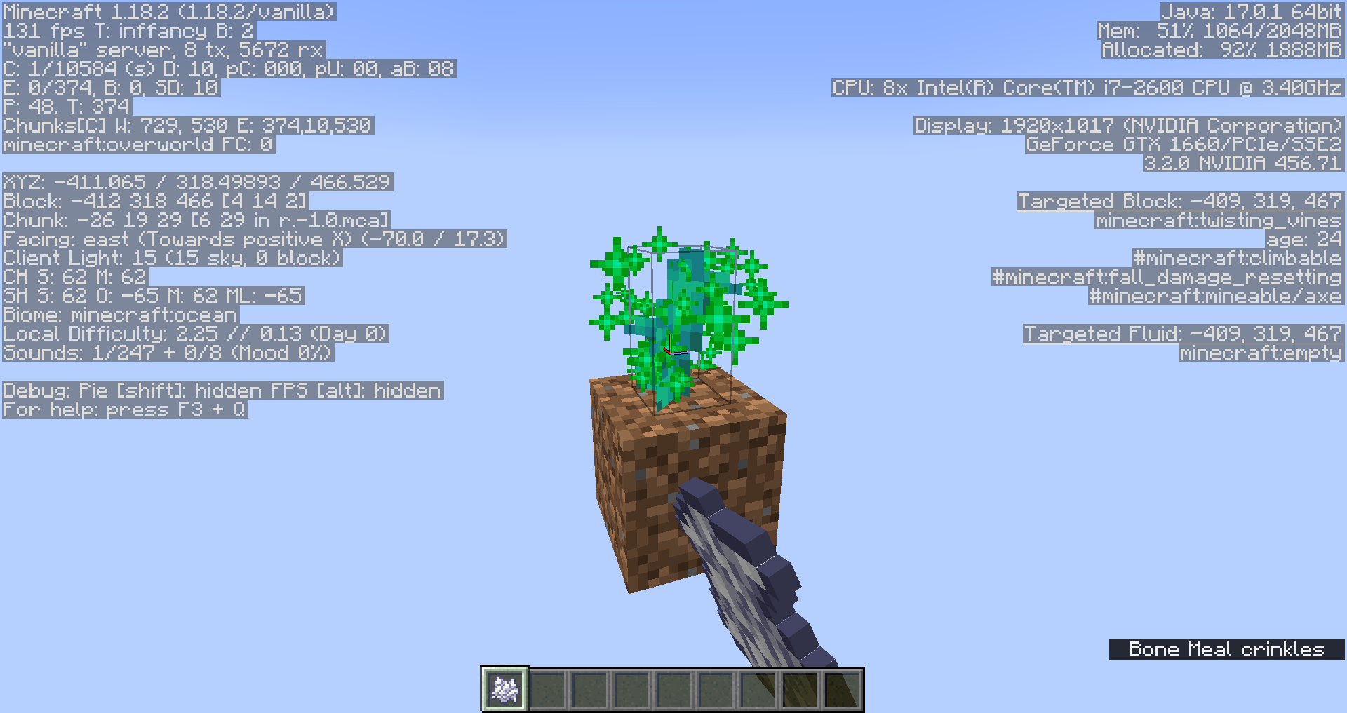 Usually when using bone meal on a twisting vine, it will continue to grow until its hits a block, and then bone meal cannot be used on it anymore, but when the twisting vine is grown to build height, bone meal can still be used on it, but it will not grow.