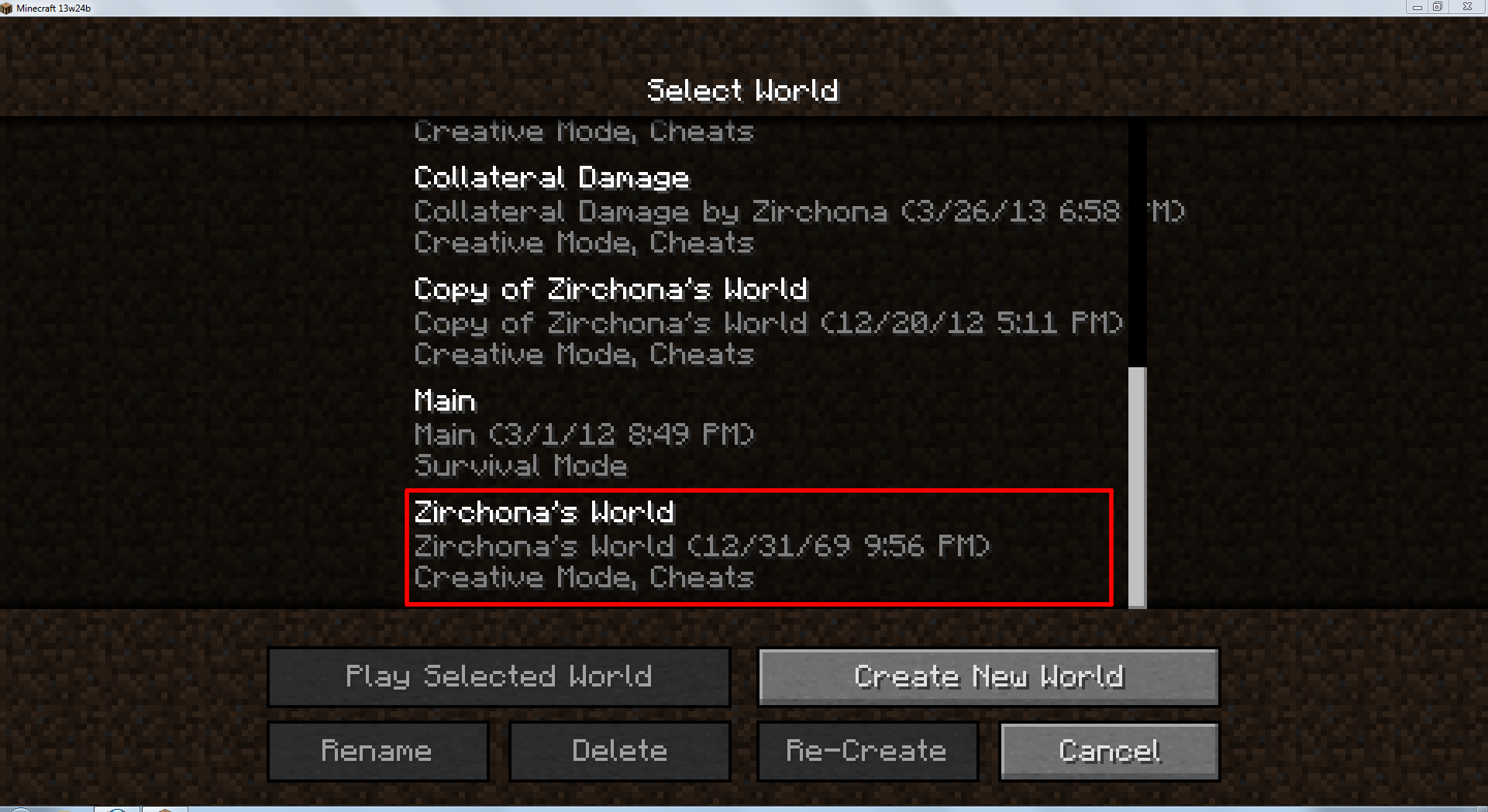 After playing snapshot 13w24b during 2013, the world moves to the bottom of the list with the date saved as 12/31/1969. Was able to replicate by playing in other worlds.