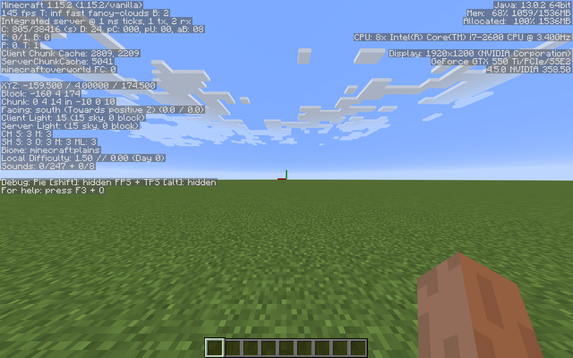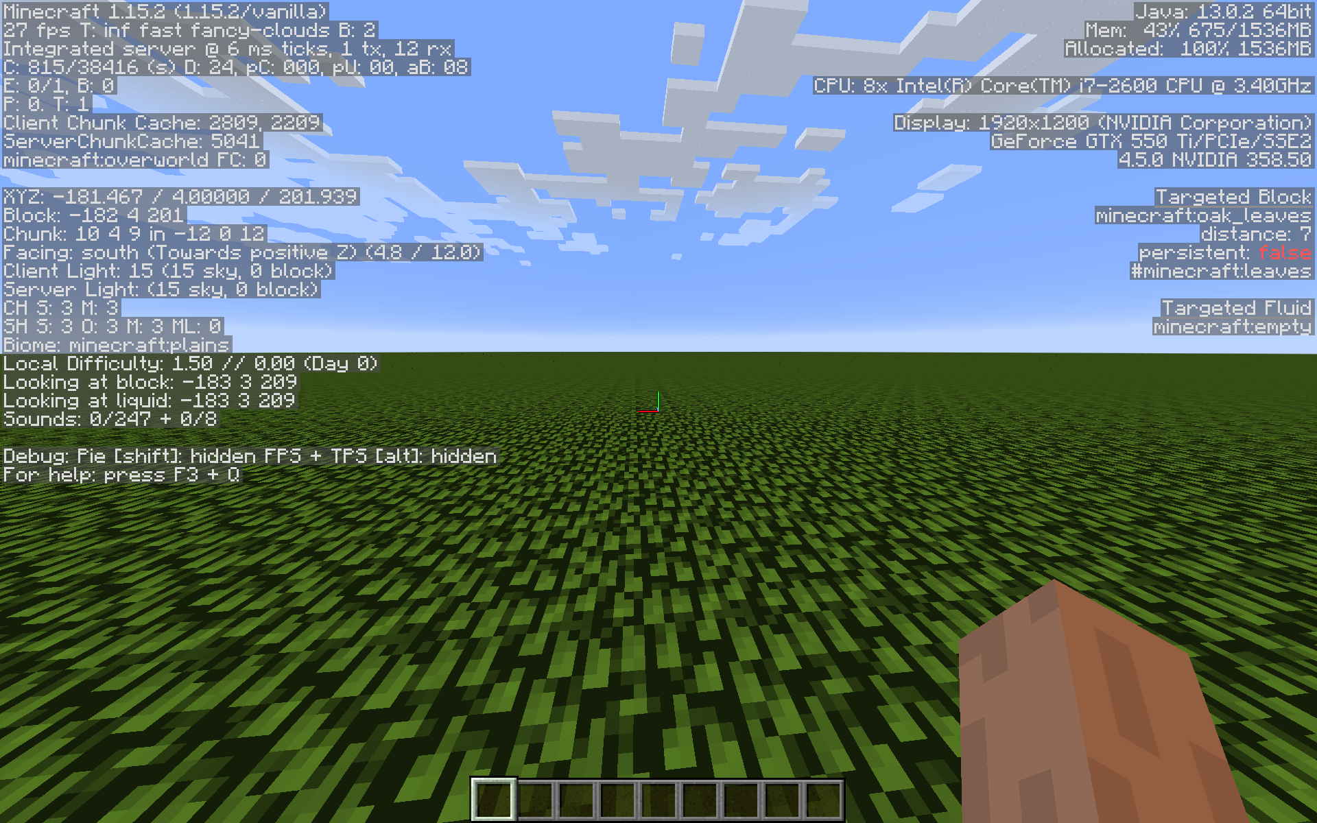 For comparison, here is the same exact scene with the mods "moreculling 1.0.0 beta 1" and "sodium 0.6.0 beta 2" both mods using defualt settings, first fancy graphics, then fast.