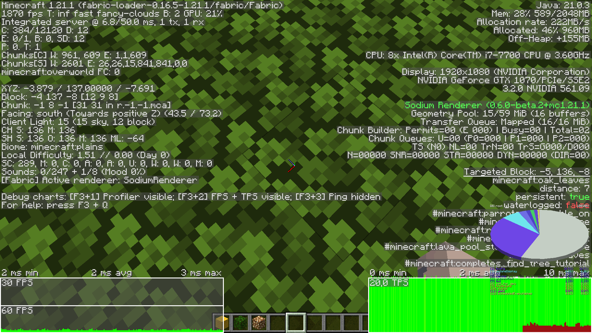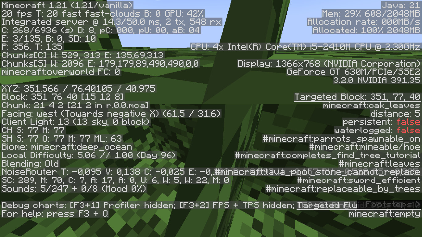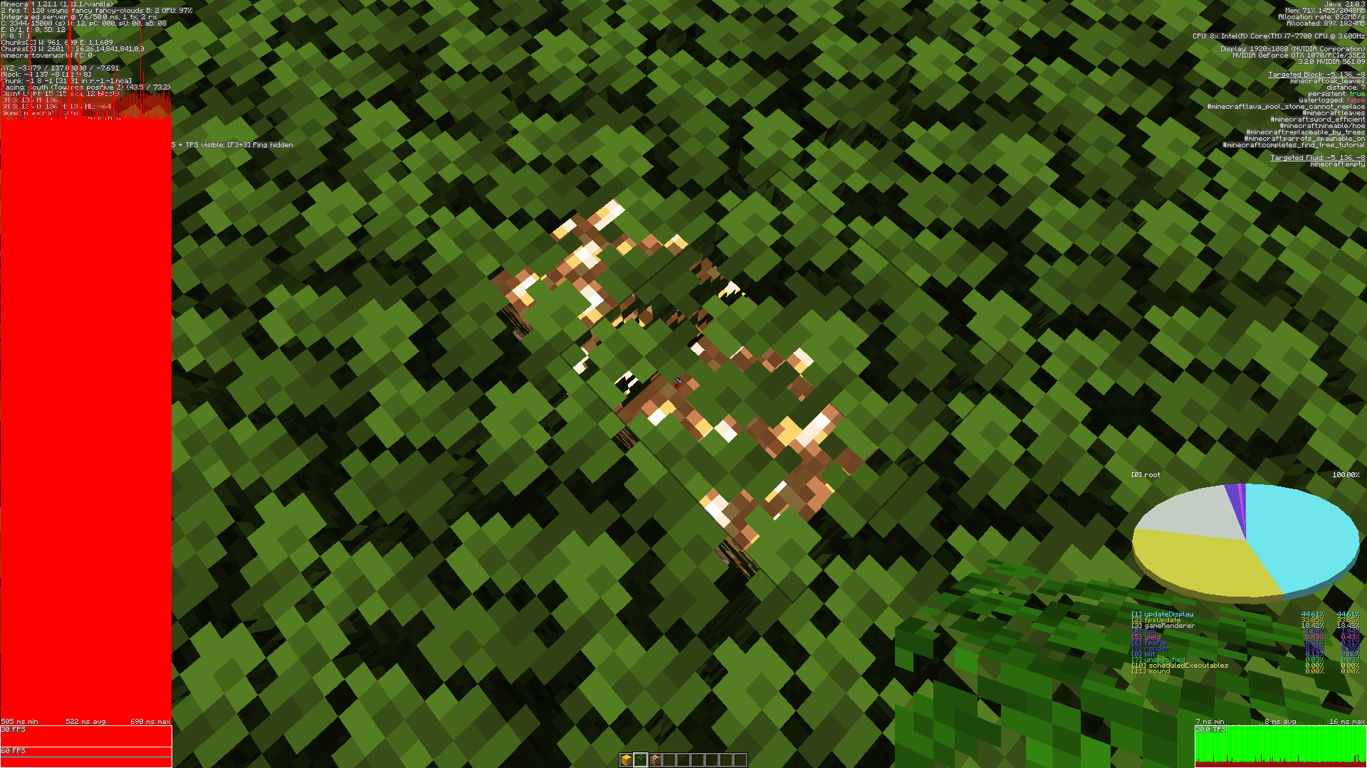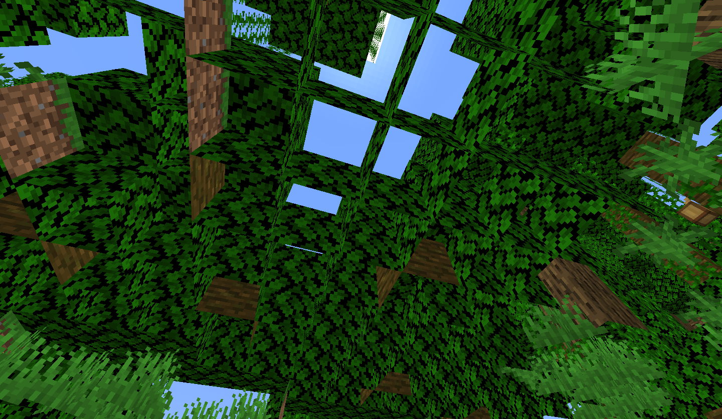 Opaque leaf blocks are not culled, dropping FPS in forest areas.