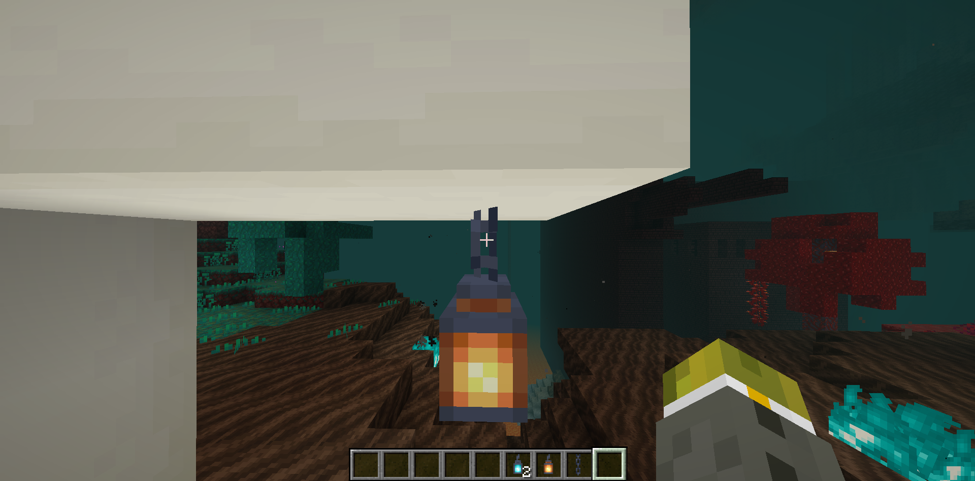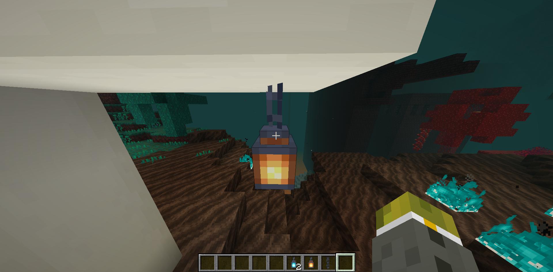 1. Place a lantern or soul fire lantern on the bottom of a block so it is hanging from said block.