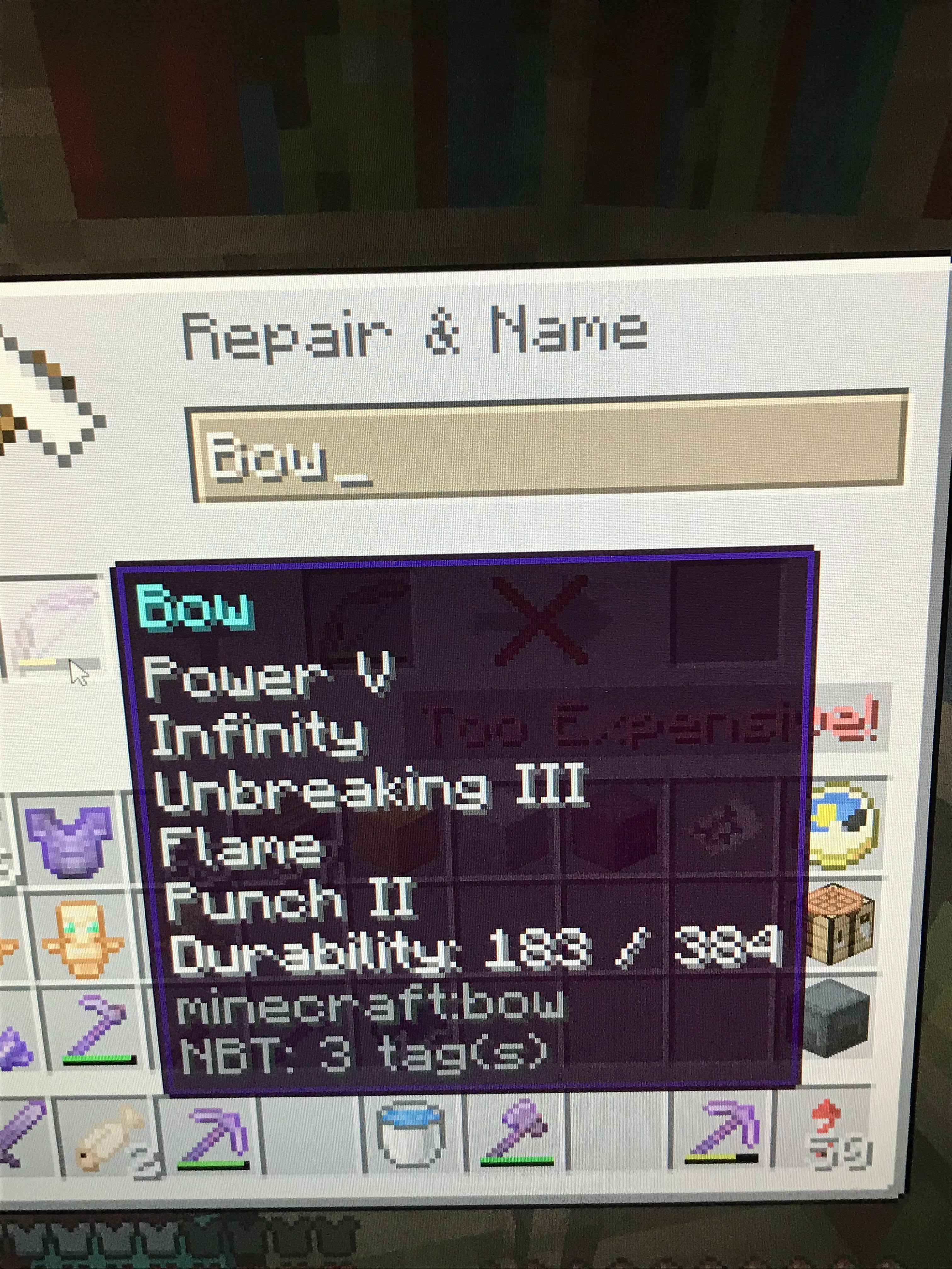 I put a bow with power 5, infinity, unbreaking 3, flame, and punch 2 into an anvil with an unenchanted bow to repair it, it where it would normally state the repair price (in experience levels) it said "Too Expensive"