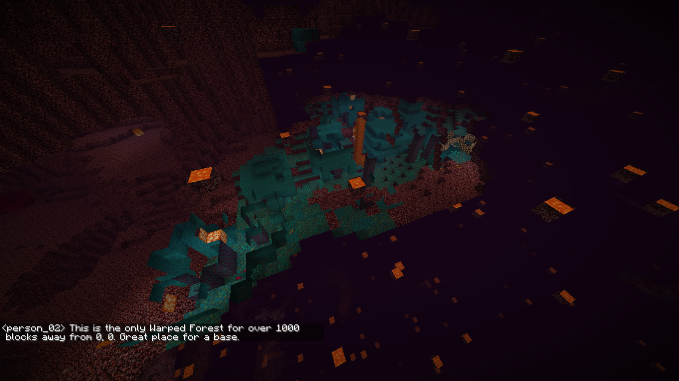 Also warped forests. I wanted them to be rarer and smaller than crimson forests, but I didn't mean a radius of 12 blocks.