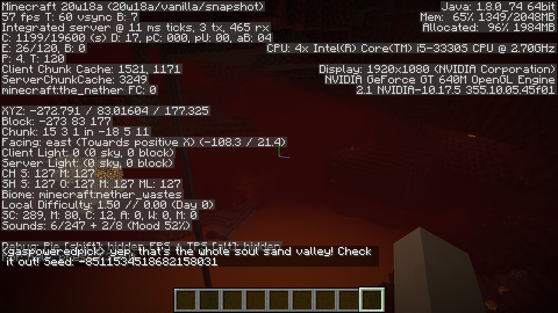 /execute in minecraft:the_nether run tp @p -1073 86 -30The 20w19a Nether biome distribution seems to be a lot more balanced, as there is a substancial amount of every biome. It greatly reduces or removes the problems the two previous biome generation has.