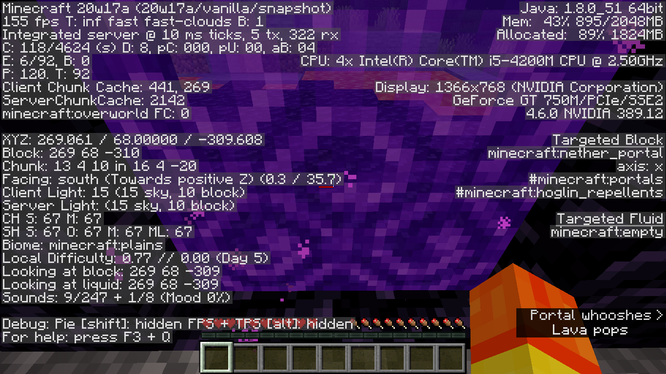 I'm unsure if this is important, but my seed was -3852560259466459530 and the coordinates of the overworld portal were 269, 68, -309.
