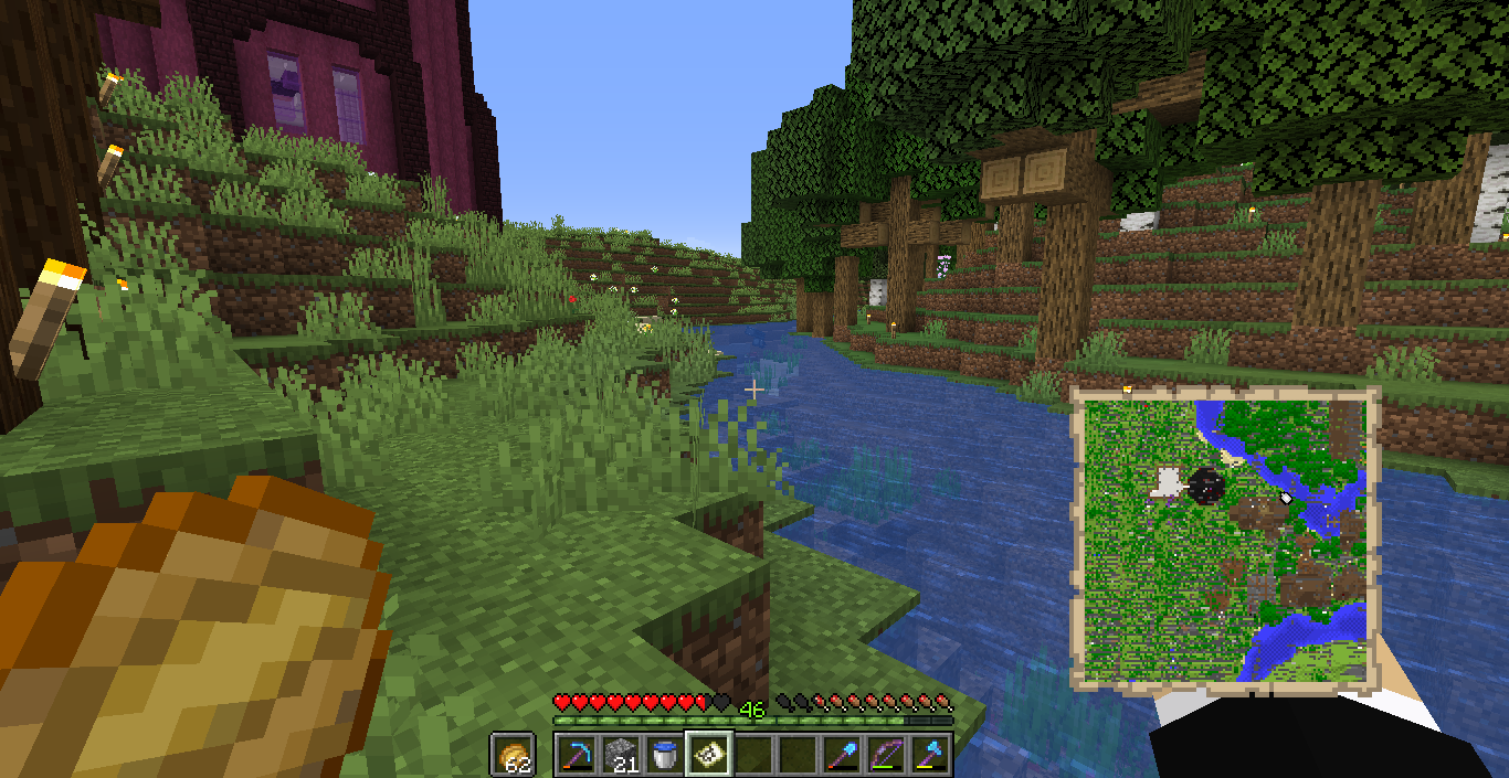 The plains biome landscape had strips of grey running through it in random horizontal lines. Buildings with shadows were occasionally greyed on the shadow side with random holes showing the color of a block underneath (such as grass if a roof was over grass) on the map. Rivers had randomly placed bridges of stone depicted far and few apart.