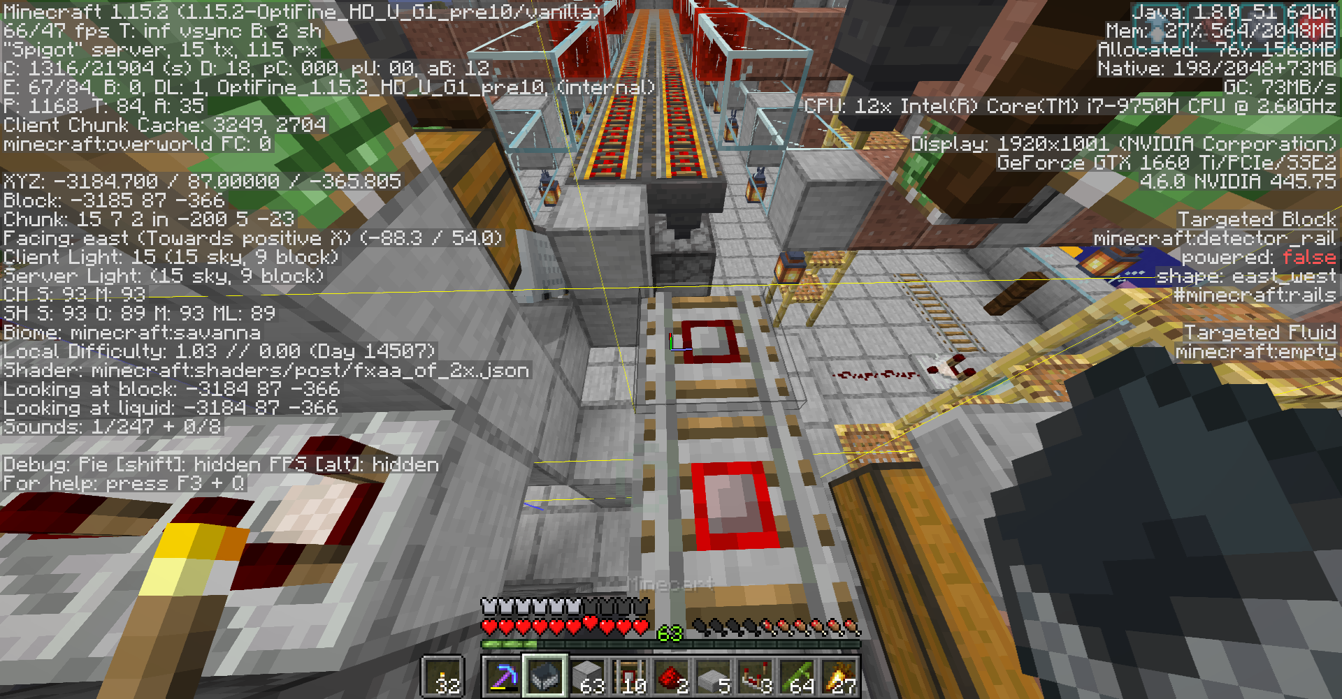 I tested the system in creative, worked fine, and tested immediately adjacent to where it is currently build, also worked fine. Attached are screenshots that include debug screen, demonstrating the unpowered detector rail, placing a minecart on the unpowered rail, and removing the minecart to see the rail remails powered (powered: true). I also included screenshots of a detector rail on the immediately adjacent block showing an unpowered detector rail, placing a minecart on it to power it, then removing the minecart to return the detector rail to a powered: false state.
