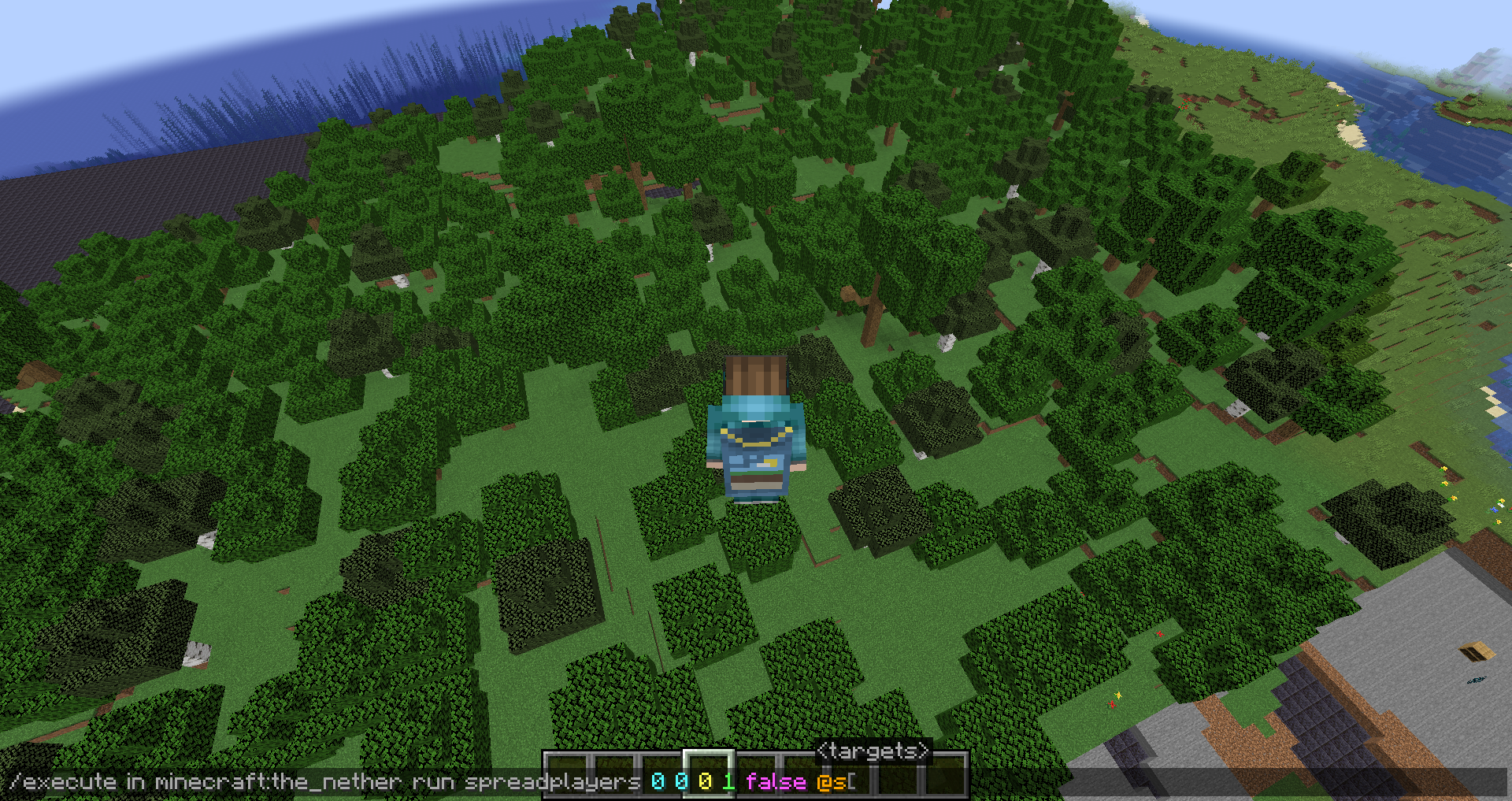 /execute in minecraft:the_nether run spreadplayers 0 0 0 1 false @sTake note of how the players are spread to the specified coordinates but remain in the overworld instead of being teleported to the specified dimension.