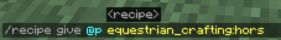 /recipe give @p equestrian_crafting:horsNotice that nothing is suggested even though "equestrian_crafting:diamond_horse_armor", "equestrian_crafting:golden_horse_armor", and "equestrian_crafting:iron_horse_armor" all have "hors" after an underscore. ❌