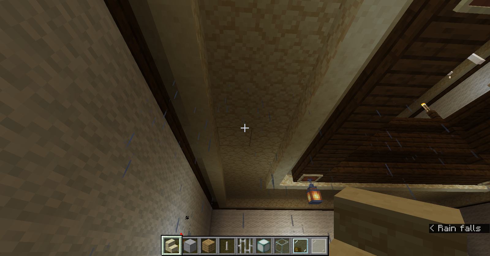 Sprites of falling water are visible under any amount of slabs and stairs, while raining, even if slabs make up a full block