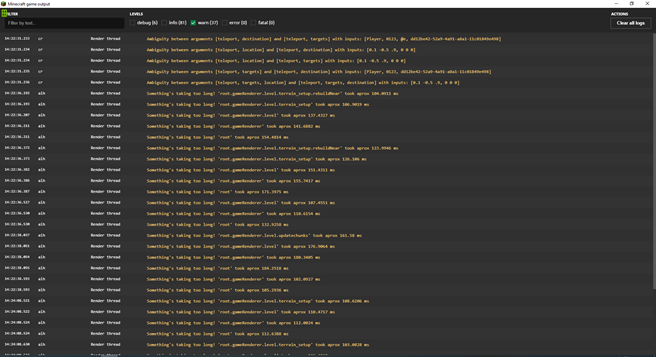 Singleplayer only. When loading new chunks via a horse it has reduced fps from 144fps(standing still) to 20fps on max settings which shouldn't happen considering my specs. On horseback loading chunks I only get these errors: