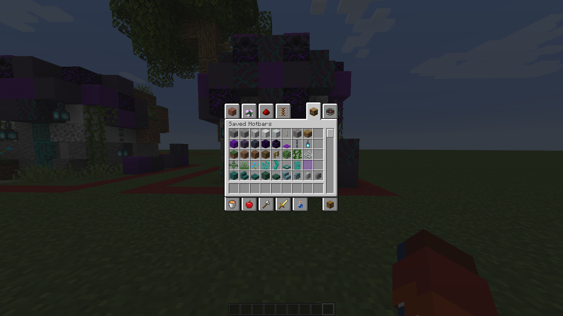 I've been experimenting with some of the new blocks of the Nether Update, trying to make something cool out of them. For that reason, I've saved up some hotbars filled with different blocks and I started building. During my building session, if I wasn't fond of a particular placement of blocks I use the pick-block function (Middle Click) to get that block in my hand and fix that one part of the build. Once I'm done building, usually I'll open my "Survival Inventory" in the creative menu, Shift + Click that red X button and clear out my inventory.