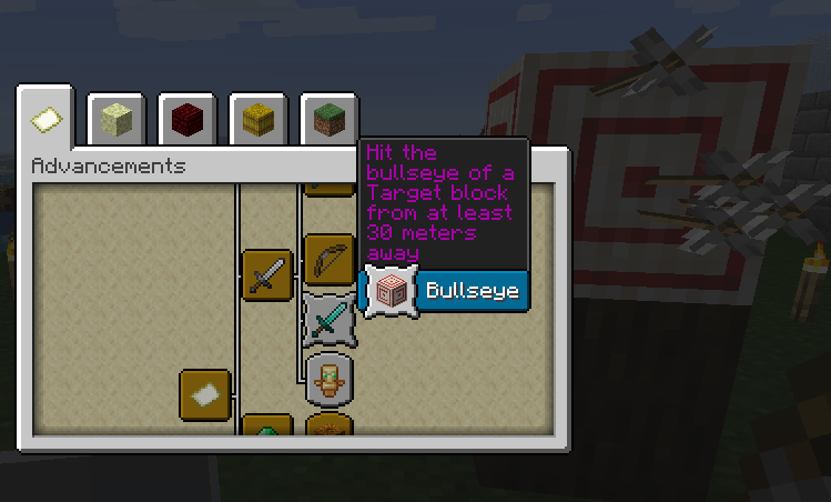 Finally got the achievement to trigger but only using a redstone mechanism.... No matter how I hit the center red square using a simple bow and arrow even in snapshot 20w22a it still wont trigger the achievement for me. (and I tried for hours 😞 )... Tried a two block high target and another one on the same plane as my avatar, still the advancement didn't trigger (and yes its still >30 blocks/meters from the target block and hitting one of the four red center pixels. Maybe the arrow shaft needs to be entirely near the cross between the 4 red center pixels? Or perhaps no other arrows must be on the target block and only the bullseye arrow? I don't really know... But since its already tested as above and I already got the advancement (despite being a bit shady) I have no more complaints 🙂