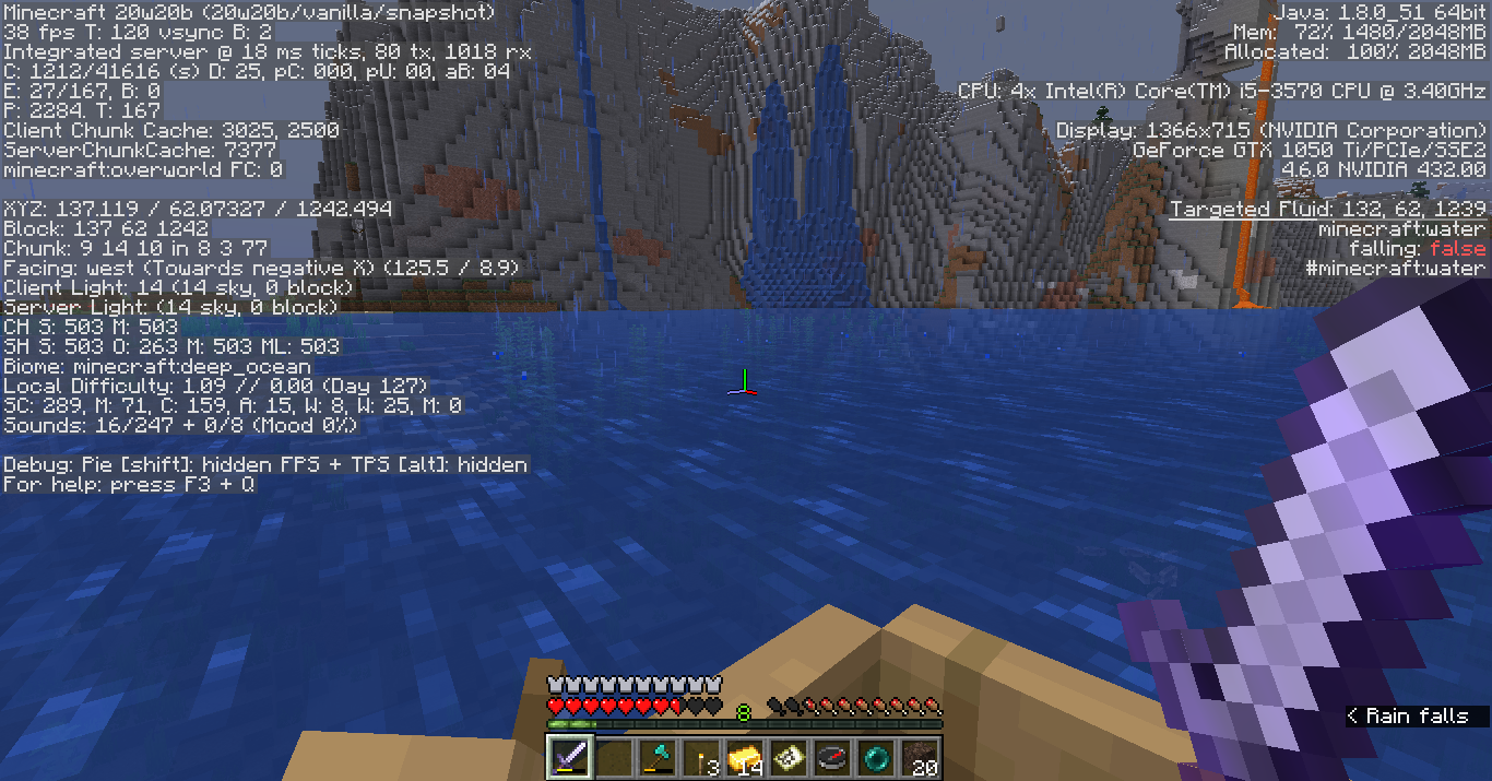 Rain seems to fall inconsistently in biomes that would normally have rain as seen in attached screenshot. Along with this rain seems to ignore solid blocks, such as when I am in my base or even down at bedrock level.