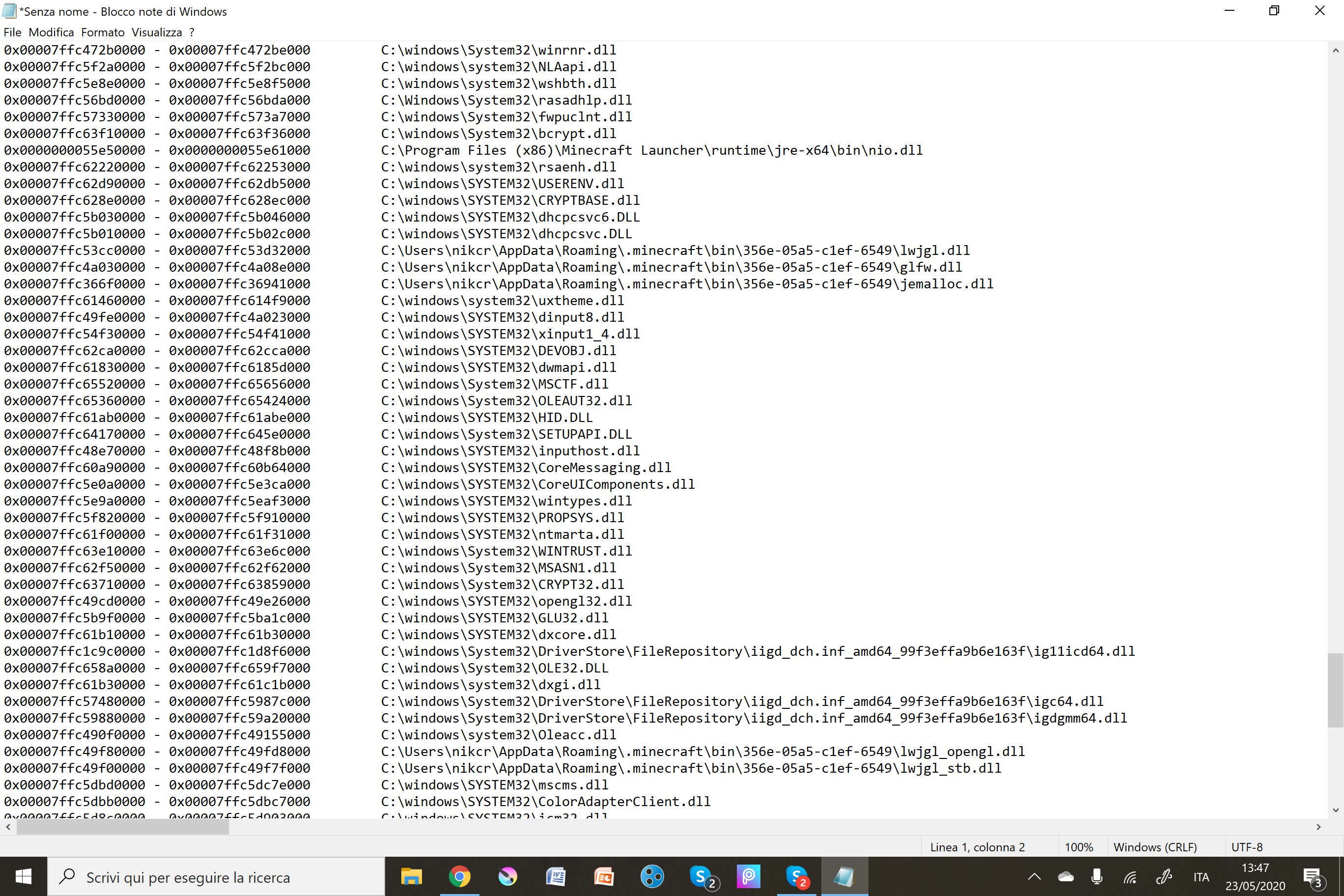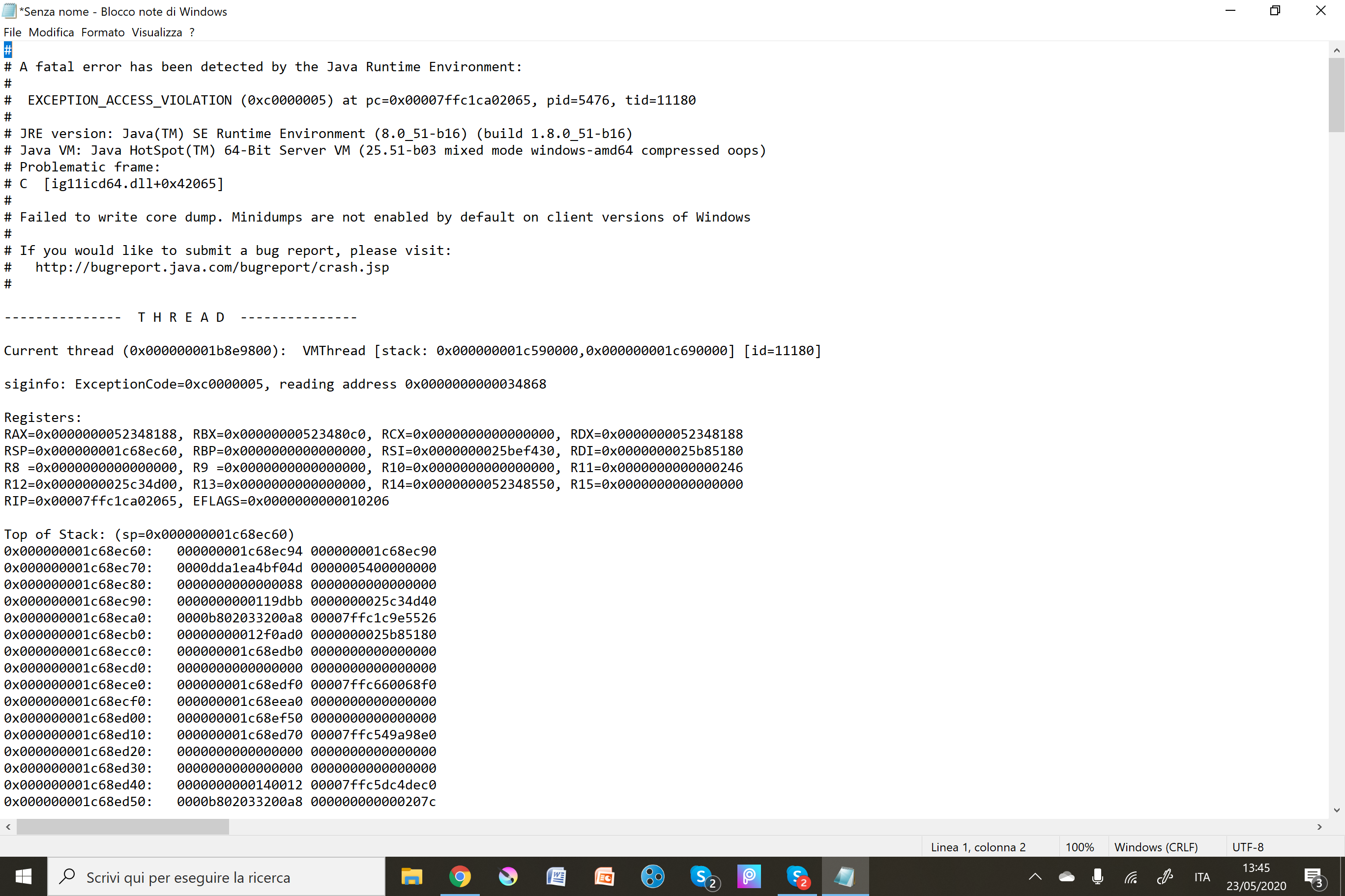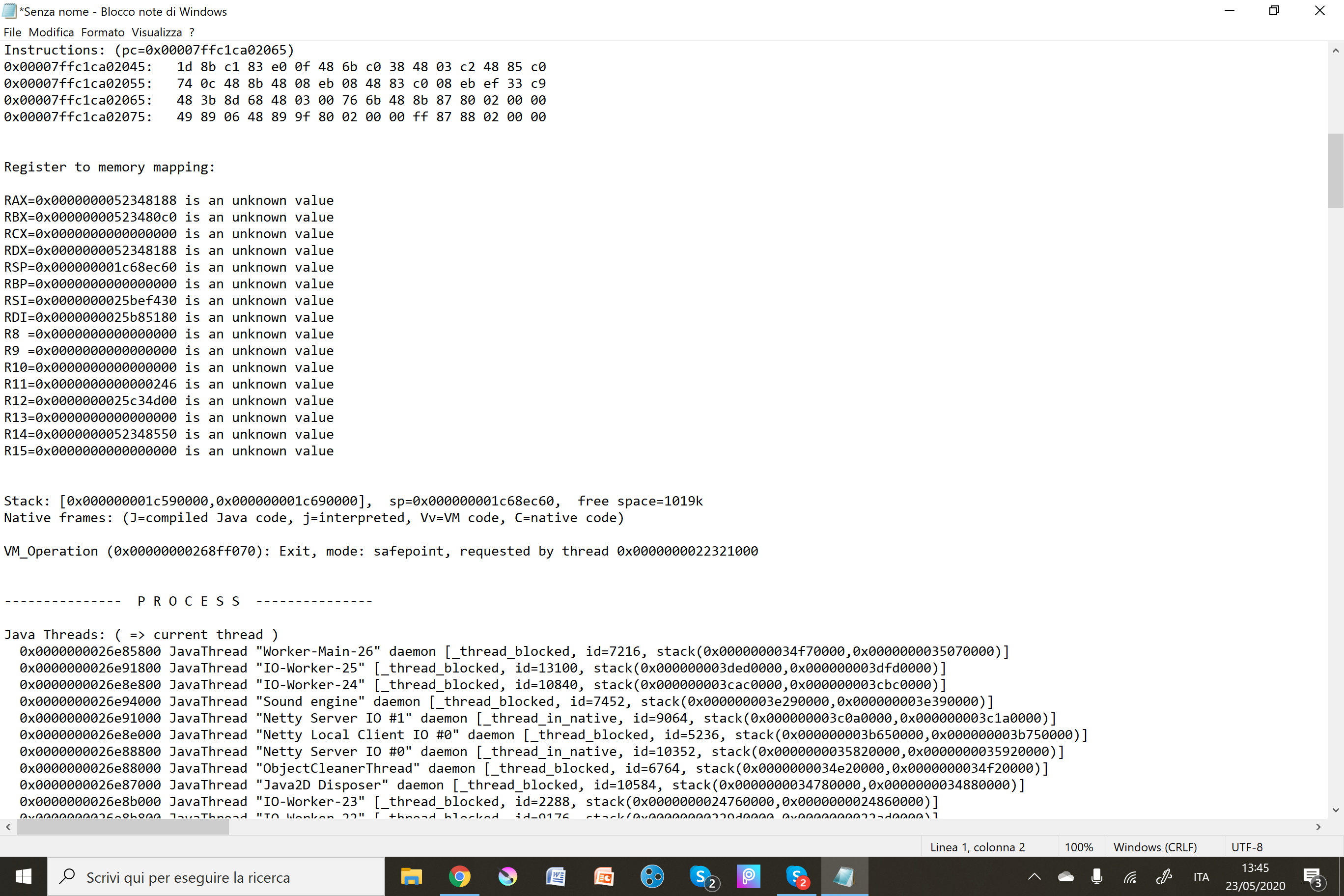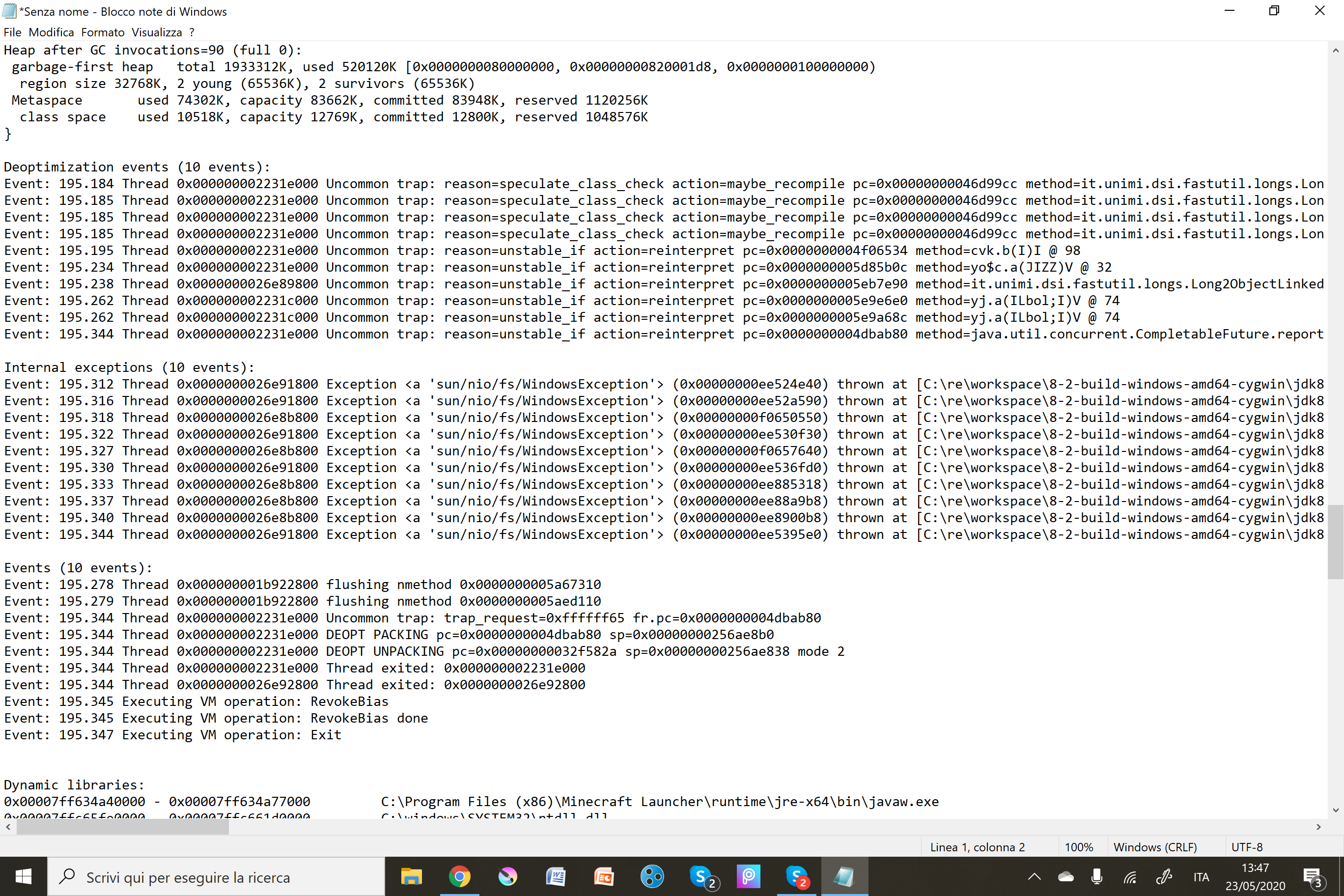 I was playing for some time on 20w21a when at some point the game closed. Every time I try to re-enter the world, after 10 to 20 seconds the game either completely feezes or just shuts down. It doesn't seem to happen in other worlds. I attached the crash report just in case it is useful.