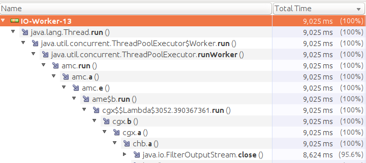 I ran the server through VisualVM. I have attached a screenshot of part of the profile results, as well as a CSV containing the entire snapshot.
