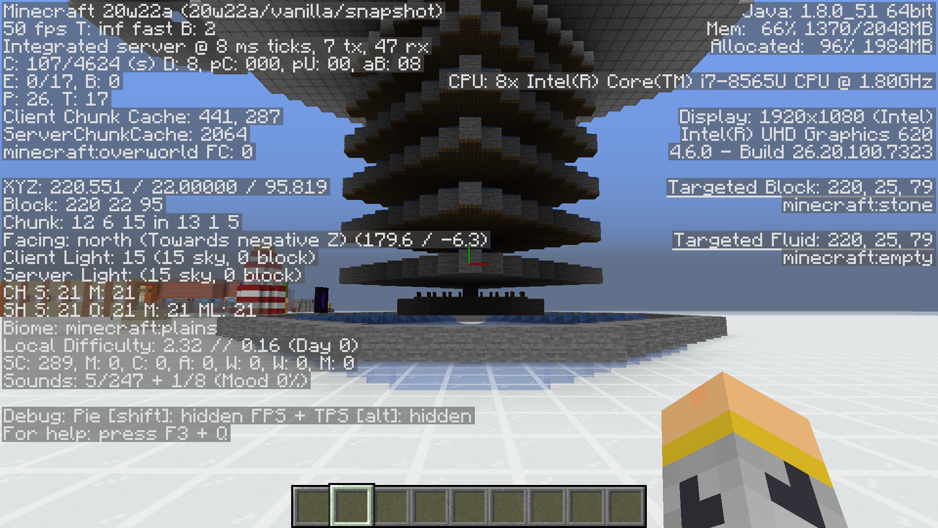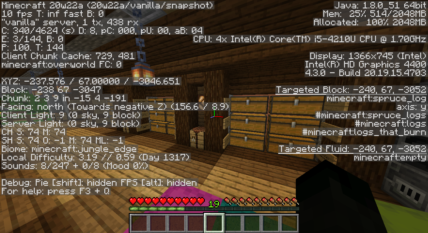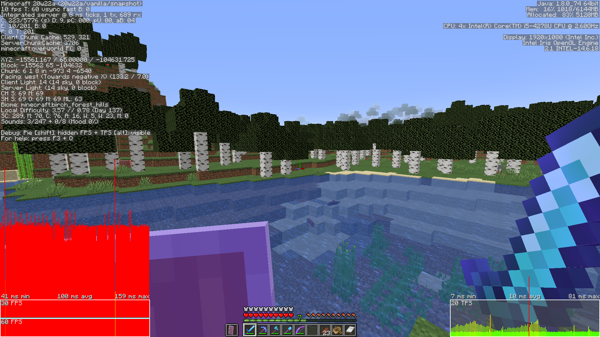I play Minecraft Java Edition in my computer, which has Windows 10 64-bit as OS, an Intel Core i5-8265U as CPU, 8GB RAM and a Intel UHD Graphics 620 as GPU. In snapshot 20w21a the framerate was stable around 30 or 35 fps. In the latest snapshot, 20w22a, the framerate is always around 12 and 21 fps and it lag every while, making the game unplayable. To have a decent framerate, I must set the render distance 2 chunks and minimum graphics. In older snapshots, I used maximum graphics and 16 chunks render distance. I don't use any resource pack