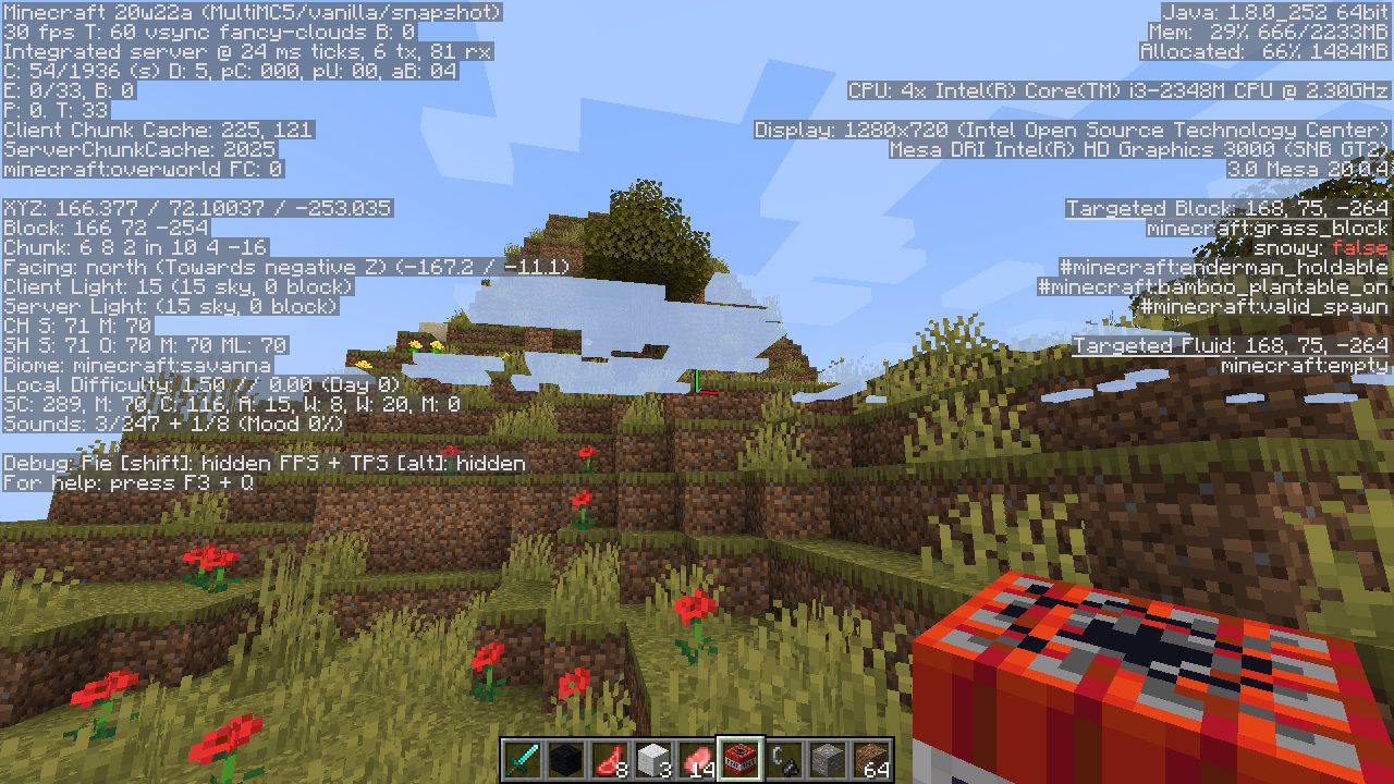 Due to the new graphics rendering changes, performance on Intel Graphics HD 3000 integrated processor is extremely worse than the last snapshot (20w21a). On 20w21a and below, the game used to run perfectly at about 59~60 fps constantly with only few fps drops when chunk was loading. Now, the game runs constantly at 30~35 fps and fps drops constantly, with very high cpu usage, making my laptop too slow.