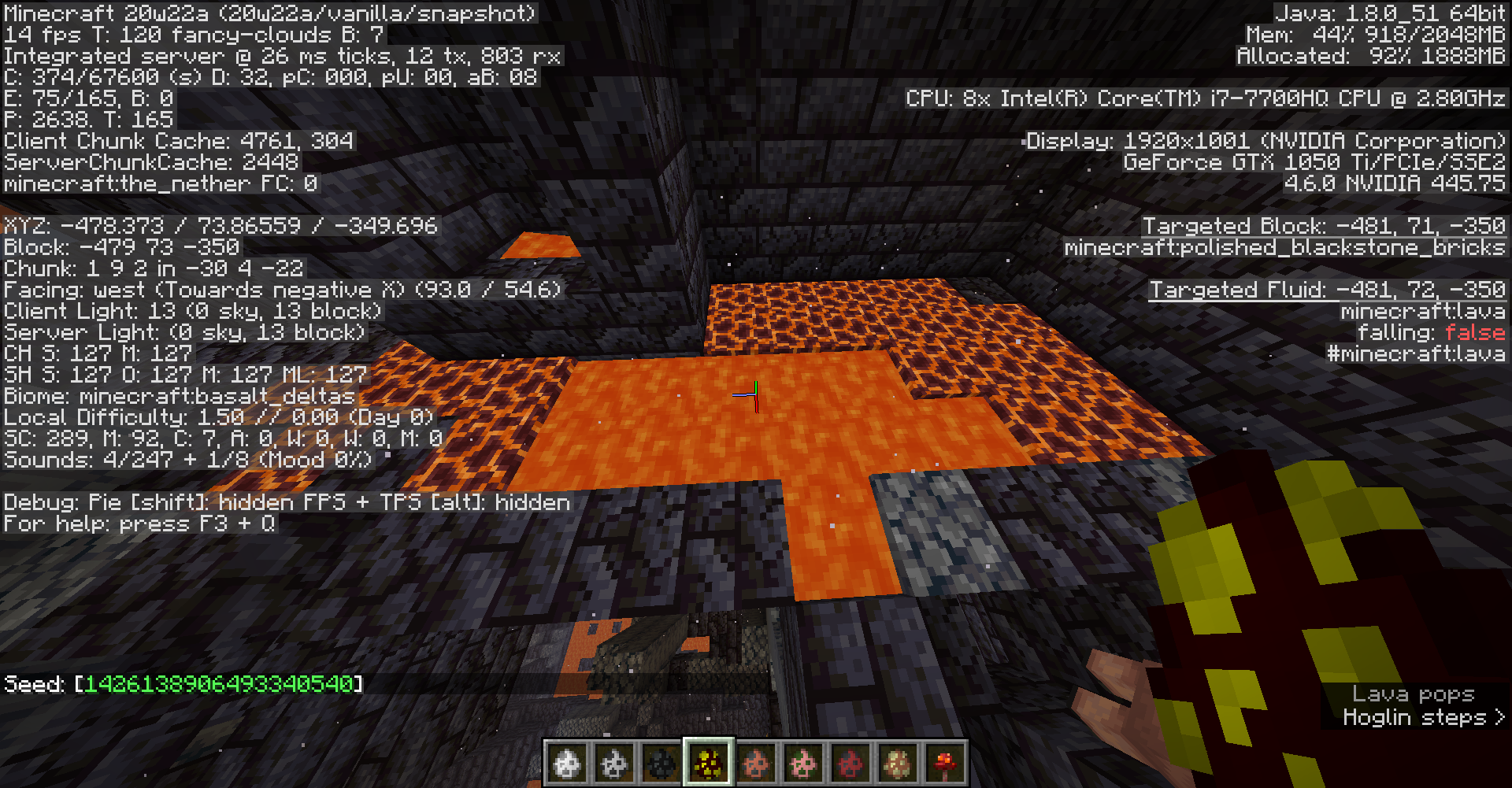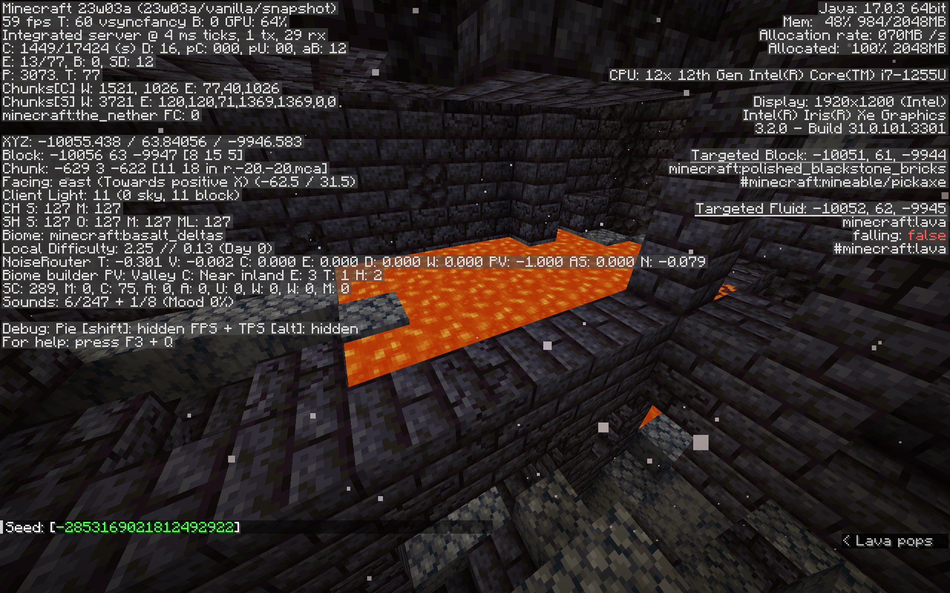 Coordinates: /execute in minecraft:the_nether run tp @s -10065.63 87.60 -9946.69 -132.46 41.57I'm sure the issue has been clearly demonstrated but wanted to mention that the basalt can also generate inside the corridors. This makes the bastions unnavigable as the corridors are completely locked off.