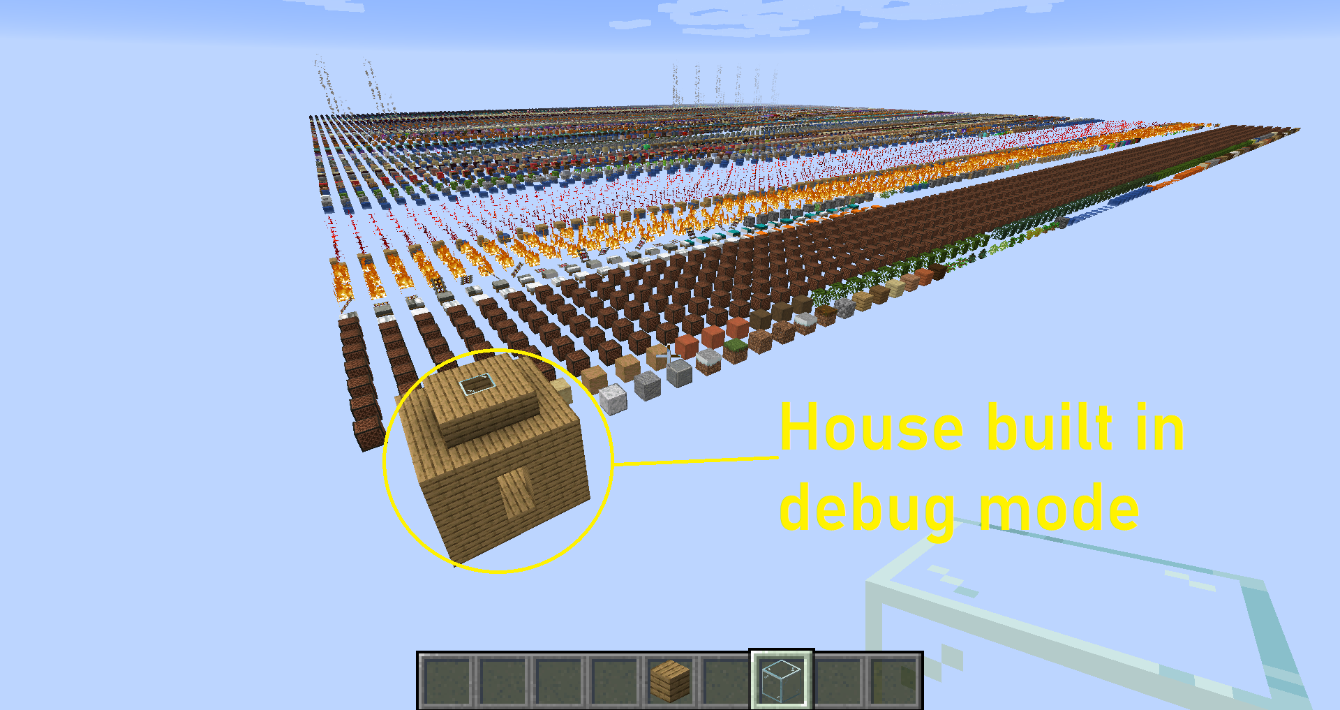 So I was on Minecraft and I decided to load of a debug world but I noticed it didn't lock any settings and the it didn't put me into spectator mode in the game, I broke a block in the debug world and the block broken, so i broke a redstone block floating in the air and it crashed my game as it broke all the redstone blocks. Also the Debug mode World type now shows up without shift clicking the World Type button.