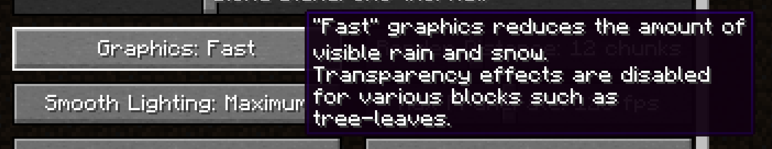 The spelling in the fast graphics tooltip is incorrect. Rather than 'tree-leaves', it should be spelled 'tree leaves', or even simplified to 'leaves' (as this behavior applies to all leaves, not just on trees)