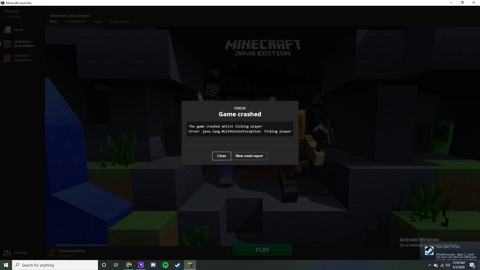 – System Details --Details: Minecraft Version: 1.16 Pre-release 1 Minecraft Version ID: 1.16-pre1 Operating System: Windows 10 (amd64) version 10.0 Java Version: 1.8.0_51, Oracle Corporation Java VM Version: Java HotSpot(TM) 64-Bit Server VM (mixed mode), Oracle Corporation Memory: 1059324728 bytes (1010 MB) / 1979711488 bytes (1888 MB) up to 2147483648 bytes (2048 MB) CPUs: 12 JVM Flags: 9 total; -XX:HeapDumpPath=MojangTricksIntelDriversForPerformance_javaw.exe_minecraft.exe.heapdump -Xss1M -Xmx2G -XX:+UnlockExperimentalVMOptions -XX:+UseG1GC -XX:G1NewSizePercent=20 -XX:G1ReservePercent=20 -XX:MaxGCPauseMillis=50 -XX:G1HeapRegionSize=32M Player Count: 1 / 8; [ze['olegermann'/124, l='ServerLevel[coronatimes2020]', x=817.15, y=74.55, z=728.45]] Data Packs: vanilla Type: Integrated Server (map_client.txt) Is Modded: Probably not. Jar signature remains and both client + server brands are untouched.