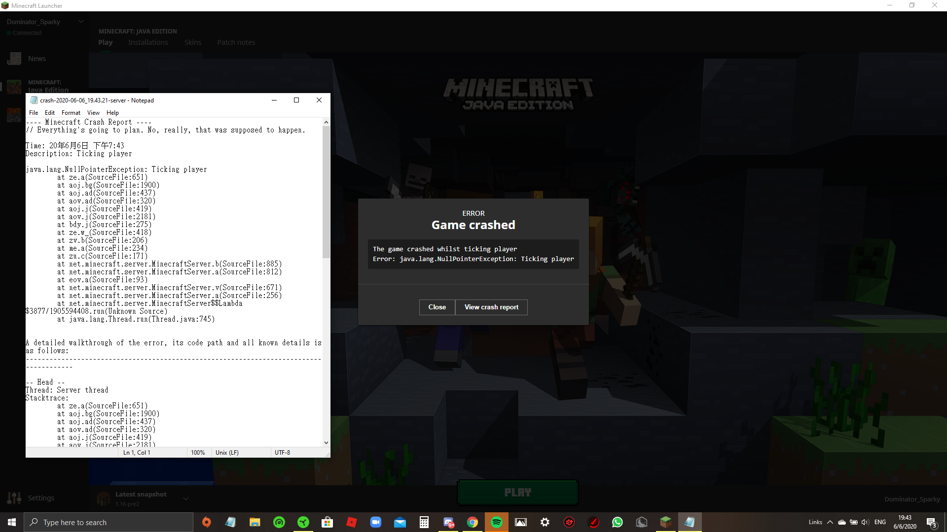 Everything works fine in the overworld, farm, build, breed, everything is ok, but once i go into the nether portal, I will be forced to jump back to the launcher, and picture 2 will pop up.