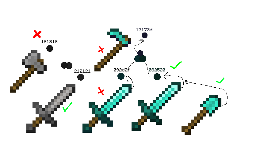 In 1.16 snapshots the Diamond sword was changed to use more colors from the old Programmers Art texture pack to look better, and the same color was even given to the edge of other diamond tools and armor to also look better. Despite this happening to diamond equipment it has not happened to other tools like stone, iron, wood, and gold, which makes for an inconsistency between all the tools. The image below shows which tools were given the same and correct colors (The ones with check marks) and the ones with different and wrong colors that are yet to be changed, (The ones with Xs) which all lead up to a combination of the colors to show how it's different and not the same like it's supposed to be. Note that the picture shows certain tools but it effects all armor and other tools that are its same material with the same colorings.