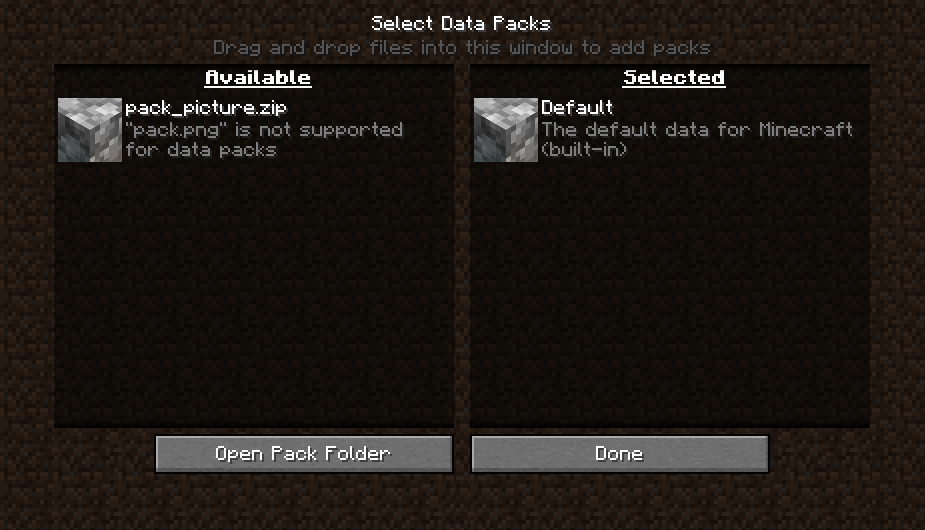 When attempting to use a pack.png file for a data pack, it would not load. Instead, a default Cobblestone block icon is used in place of the file just like the vanilla data pack.