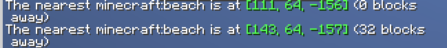 I did some testing to attempt to find a point that will report as 1 block away from a beach biome, but didn’t find any. The results are shown in the image below, with emerald blocks placed where the biome was reported as 32 blocks away, melon blocks where it was 45 blocks away, and chiseled stone bricks where it was 0 blocks away.