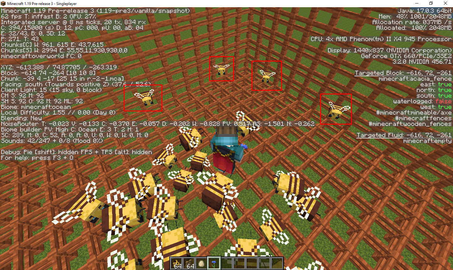 I saw some reports of this issue for earlier versions, and in this report ( MC-159447) the issue was supposedly fixed. I didn't know what to do to report a bug and when trying to sign in my minecraft.net account info did not work so I made a new account to post this bug report. After seeing many snapshots talking about all these fixes I did not see any talk about fixing bees being stuck to fences. Hope I'm not the only one dealing with this. I have a couple screenshots and I put in blocks from 1.16 in it to show that was the version I was playing (1.16 pre5 specifically).Β