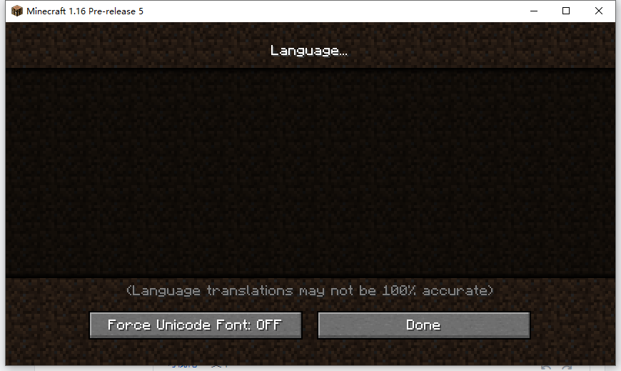 It looks like this picture.I first opened the game,then I wanted to change the language to Chinese,but I saw nothing on the interface,so I knew I cannot change any languages.Although it may not be a big deal,I'm used to playing Minecraft in Chinese.Anyway,someone may use other languages except English.(The version in the picture is 1.16 Pre-release 5)